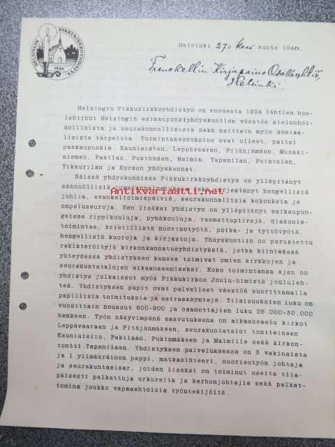 Helsingin Pikkukirkkoyhdistys, Helsinki, 27.6.1940 -asiakirja / firmalomake