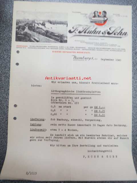 F. Huhn & Sohn, Hamburg, 8.9.1940 -asiakirja / firmalomake
