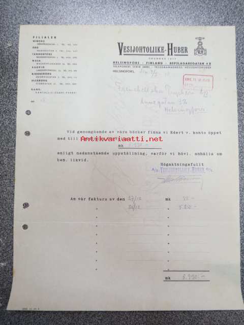 Vesijohtoliike-Huber, Helsingfors, 9.2.1940 -asiakirja / firmalomake