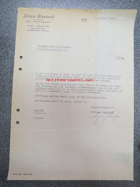 Iittala Glasbruk, Iittala, 11.10.1940 -asiakirja / firmalomake