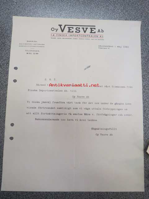 Oy Vesve Ab, Helsinki, 1.5.1940 -asiakirja / firmalomake