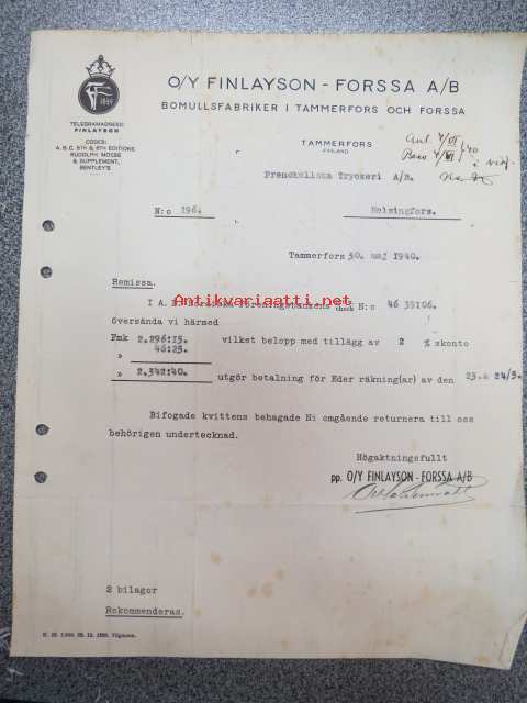 Oy Finlayson-Forssa Ab, Tampere, 30.5.1940 -asiakirja / firmalomake