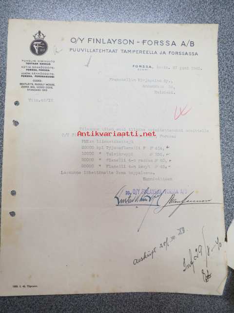 Oy Finlayson-Forssa Ab, Tampere, 27.6.1940 -asiakirja / firmalomake