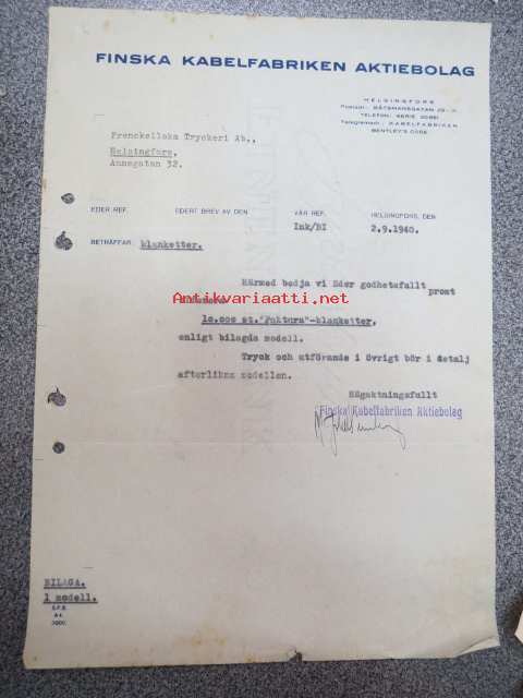 Finska Kabelfabriken Ab, Helsingfors, 2.9.1940 -asiakirja / firmalomake
