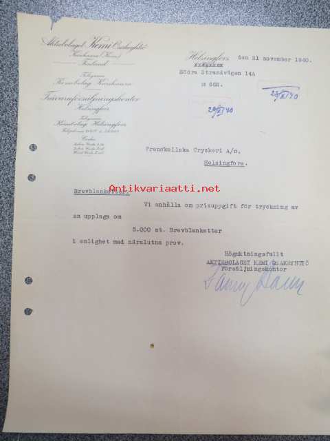 Aktiebolaget Kemi Osakeyhtiö, Helsingfors, 21.11.1940 -asiakirja / firmalomake