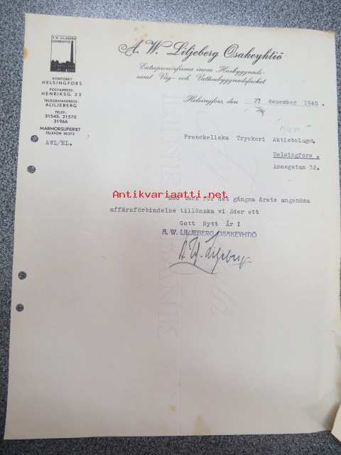 A.W. Liljeberg, Helsingfors, 27.12.1940 -asiakirja / firmalomake