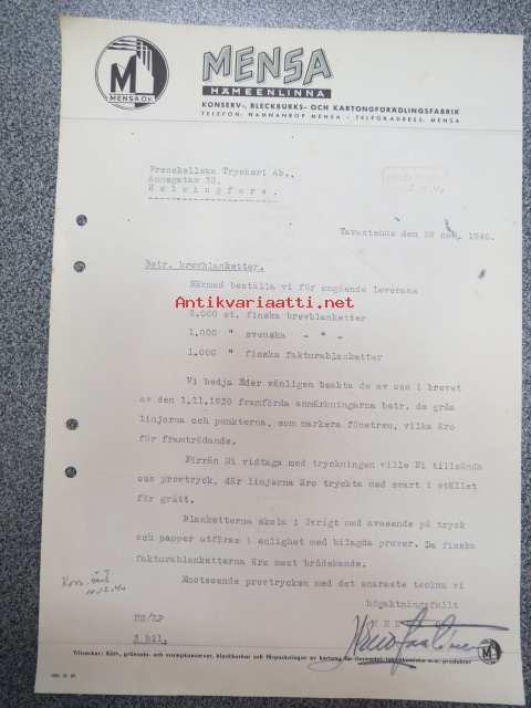 Mensa, Hämeenlinna, 29.11.1940 -asiakirja / firmalomake