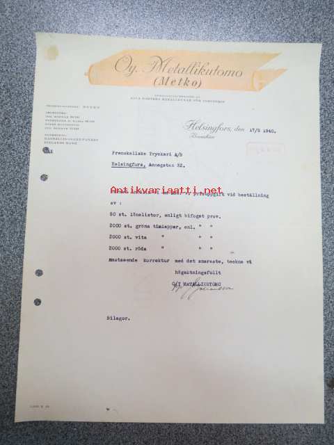 Oy Metallikutomo - Metko, Brunakärr, 17.5.1940 -asiakirja / firmalomake