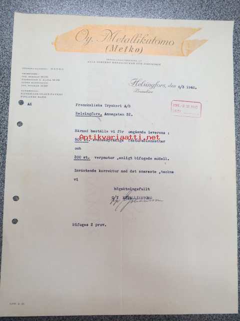 Oy Metallikutomo - Metko, Brunakärr, 6.3.1940 -asiakirja / firmalomake