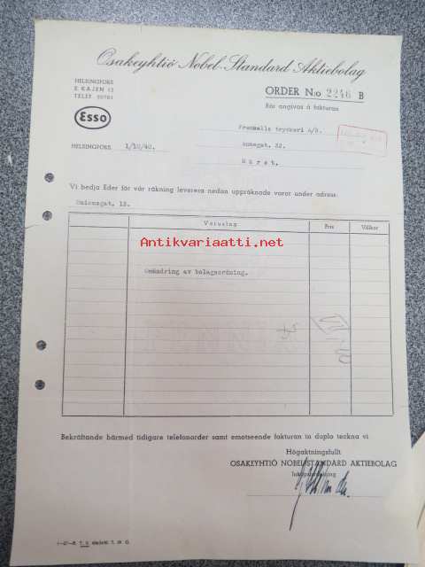 Osakeyhtiö Nobel-Standard Ab, Helsingfors, 1.10.1940 -asiakirja / firmalomake