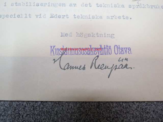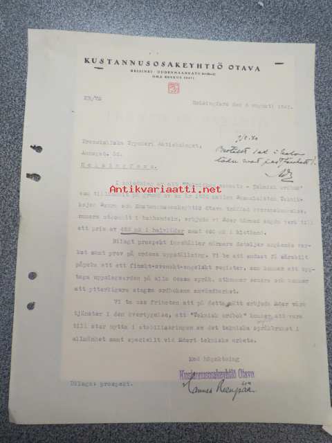 Kustannusosakeyhtiö Otava, Helsinki, 6.8.1940 -asiakirja / firmalomake, allekirjoitus Hannes Reenpää