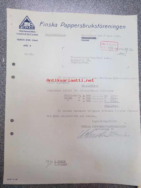 Finska Pappersbruksföreningen, Björneborg, 6.3.1940 -asiakirja / firmalomake