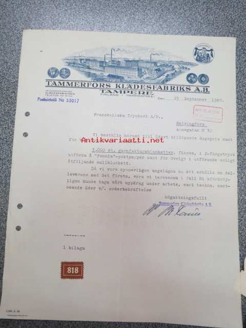 Tammerfors Klädesfabriks Ab, Tampere, 25.9.1940 -asiakirja / firmalomake
