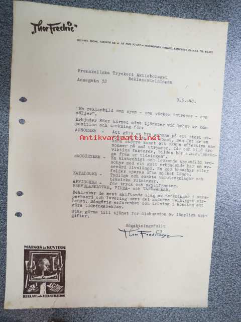 ThorFredric / Thor Fredricson) Mainos ja kuvitus / Reklam och illustration, Helsinki, 9.5.1940 -asiakirja / firmalomake