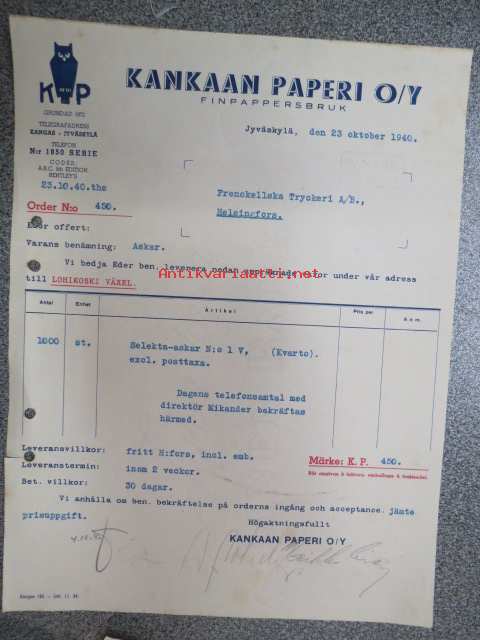 Kankaan Paperi Oy, Jyväskylä, 23.10.1940 -asiakirja / firmalomake