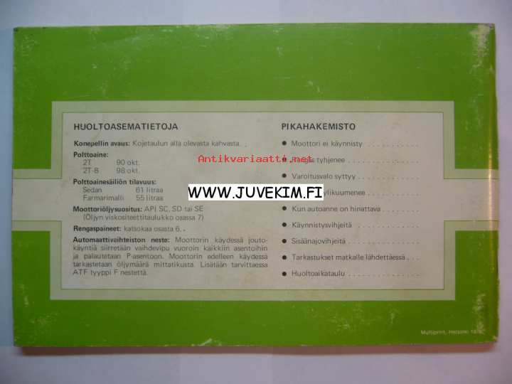 | Saatavilla | 1 kpl | | Julkaisuvuosi | 1978 | | Sivuja | 76 | | Kunto | K3 | | Sidonta/painoasu | Nidottu (pehmeäk.) | | Kielet | Suomi |