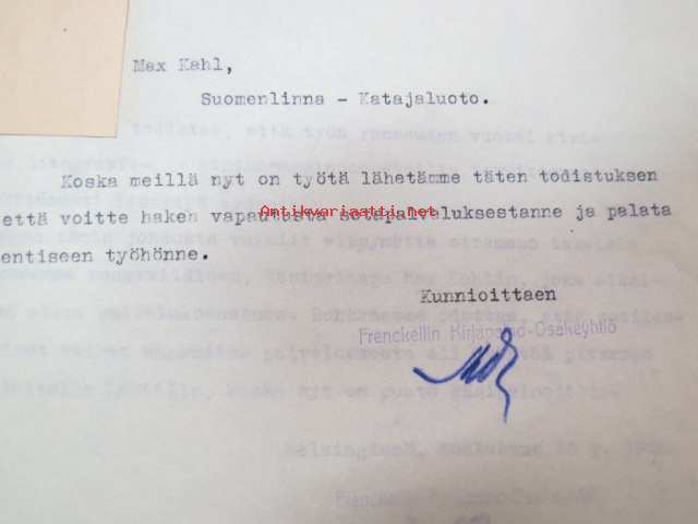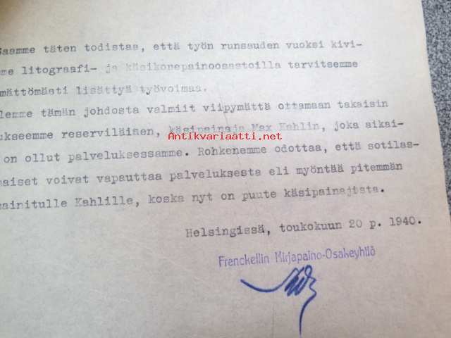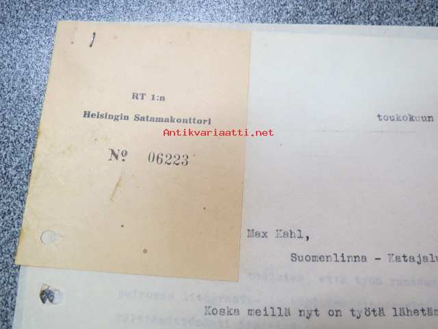 RT 1:n (Rannikkotykistörykmentti) Helsingin Satamakonttori No 06223, 20.5.1940 -asiakirja / firmalomake
