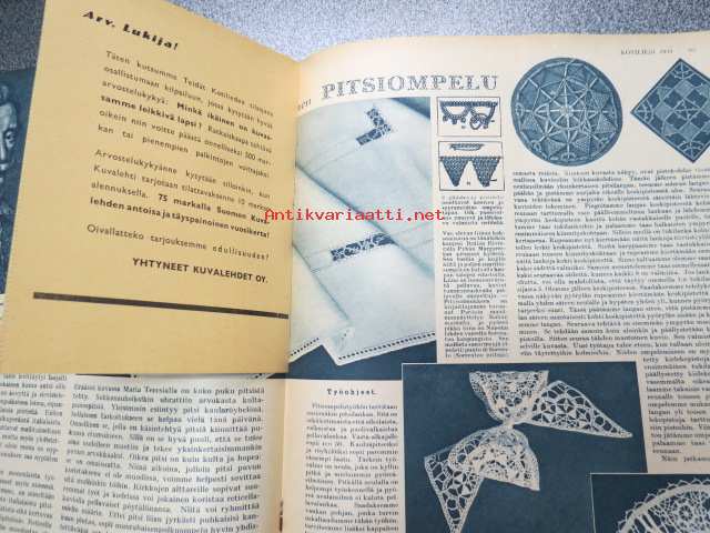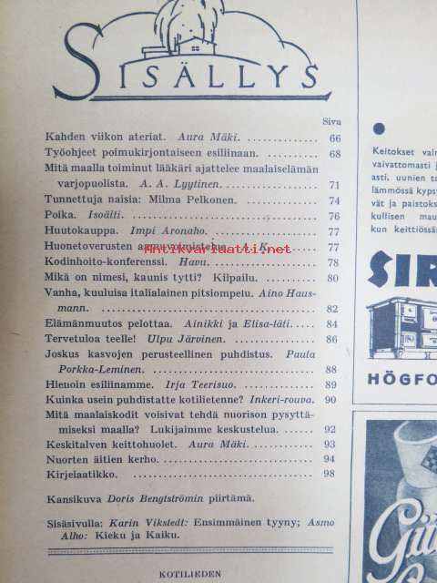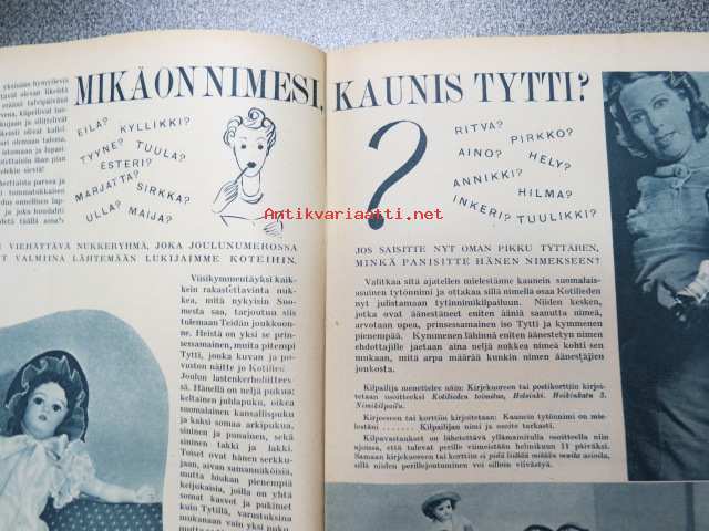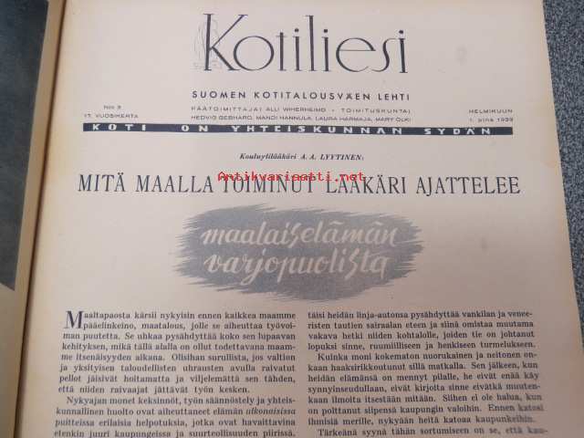 Kotiliesi 1939 nr 3, 1.2.1939, helmikuu I, sis. mm. seur. artikkelit / kuvat / mainokset; Kansikuvitus Doris Bengström (Tytti, Kotilieden lahjanukke), Ensimmäinen tyyny, teko-ohje sivu 2, Mitä maalla toiminut lääkäri ajattelee maalaiselämän varjopuolista, Tunnettuja naisia - Sokeain miesten työkoulun johtaja Milma Pelkonen, Kodinhoito-konferenssi, Italialainen pitsiompelu, Tervetuloa teelle, KUinka usein puhdistatte kotilietenne?, Mitä maalaiskodit voivat tehdä nuorison pysyttämiseksi maalla?, Keskitalven keittohuolet, Havin Vaahto-jauhe, Kieku ja Kaiku Amerikan-matka 3, ym.21 x 28 cm.