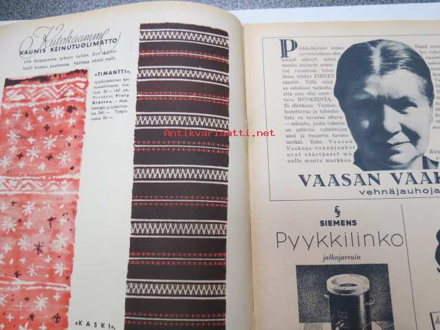 Kotiliesi 1939 nr 19, lokakuu I, 1.10.1939, sis. mm. seur. artikkelit / kuvat / mainokset; Kansikuvitus P. Söderström, Kutokaamme kaunis keinutuolinmatto,