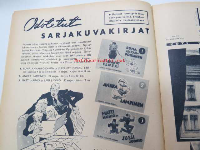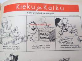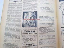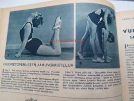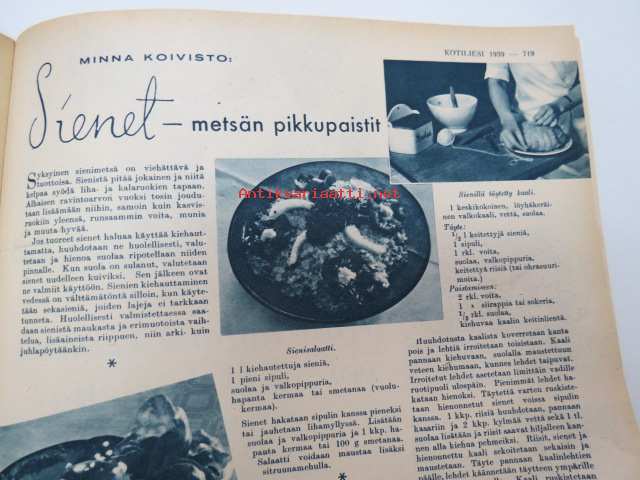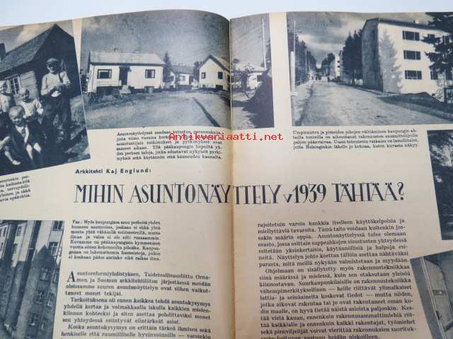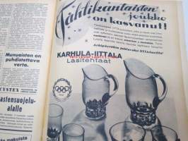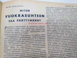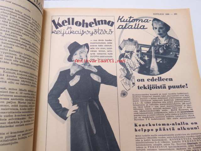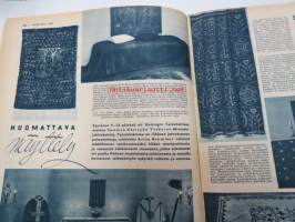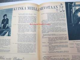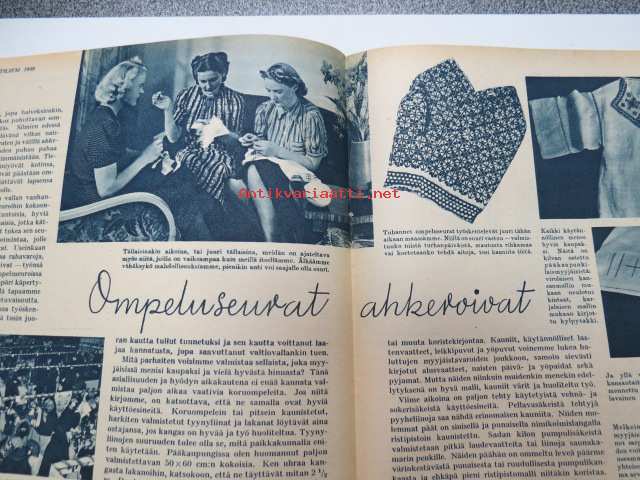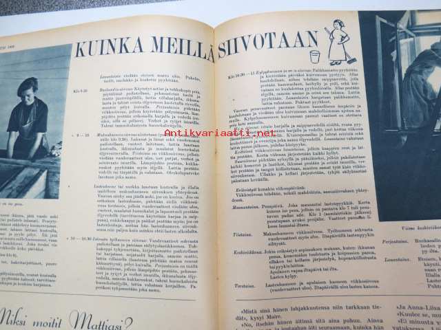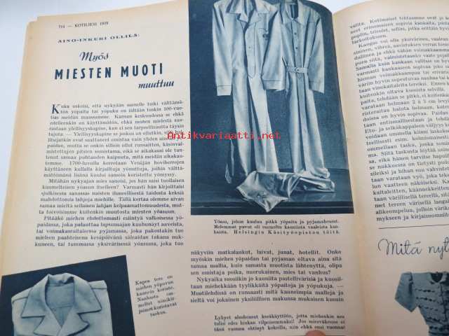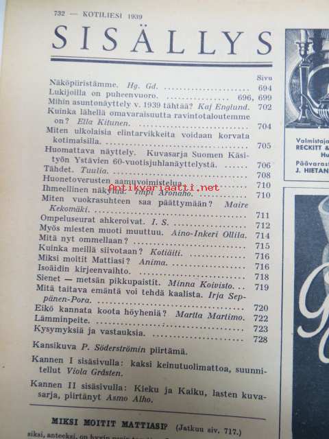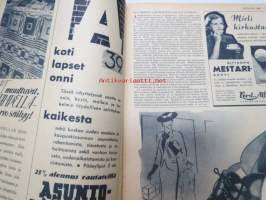 Kotiliesi 1939 nr 19, lokakuu I, 1.10.1939, sis. mm. seur. artikkelit / kuvat / mainokset; Kansikuvitus P. Söderström, Kutokaamme kaunis keinutuolinmatto, Mihin asuntonäyttely v. 1939 tähtää?, Suomen Käsityön ystävien 60-vuotisnäyttely, Huonetoverusten aamuvoimistelua, Miten vuokrasuhteen saa päättymään, Ompeluseurat ahkeroivat, Myös miesten muoti muuttuu, Kuinka meillä siivotaan, Soienet - metsän pikkupaistit, Eikö kannata koota höyheniä?, Palmu valoviiru hiussaippua, Kieku ja Kaiku, ym.21 x 28 cm.