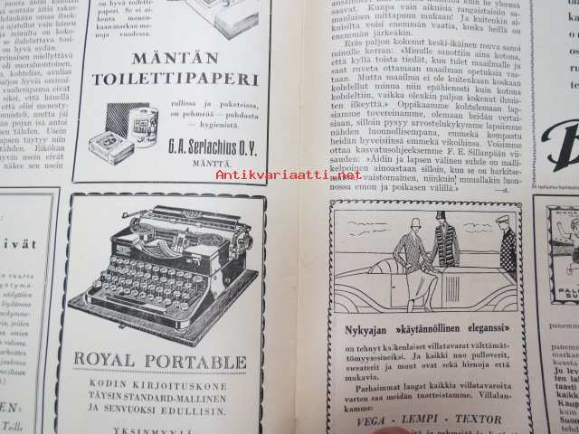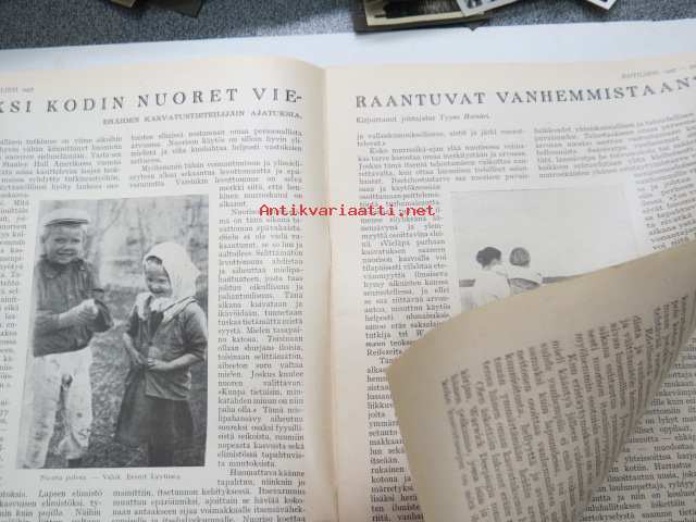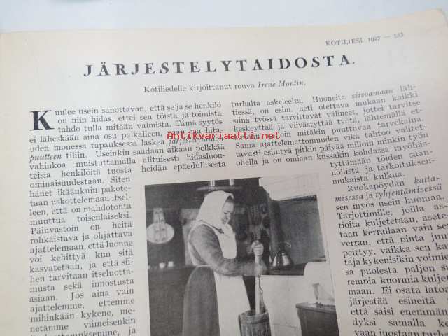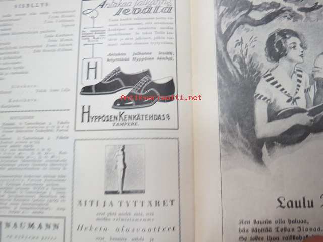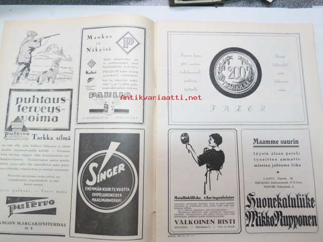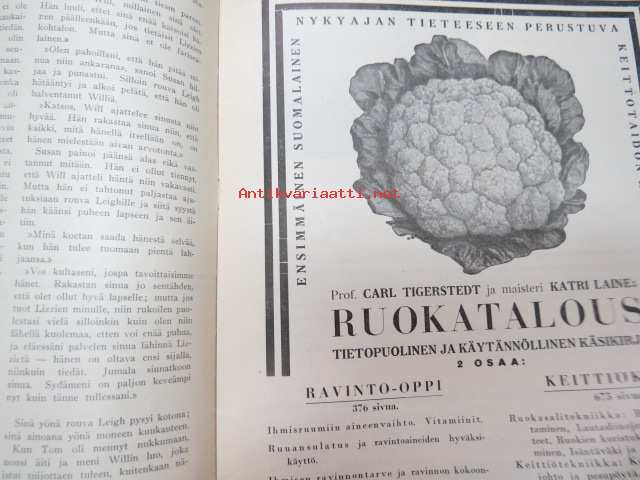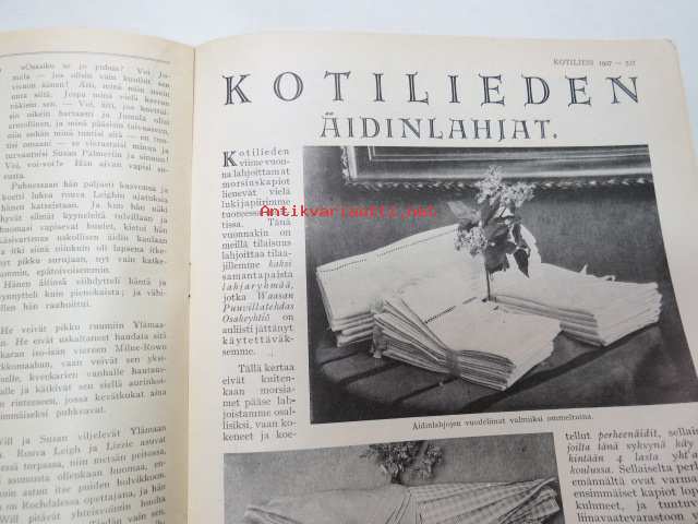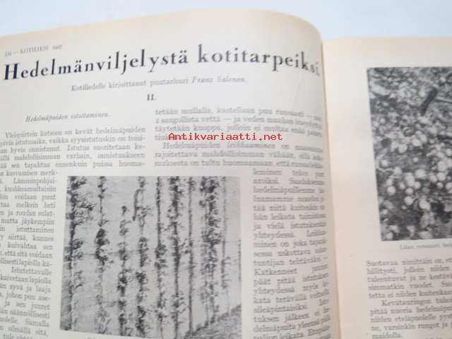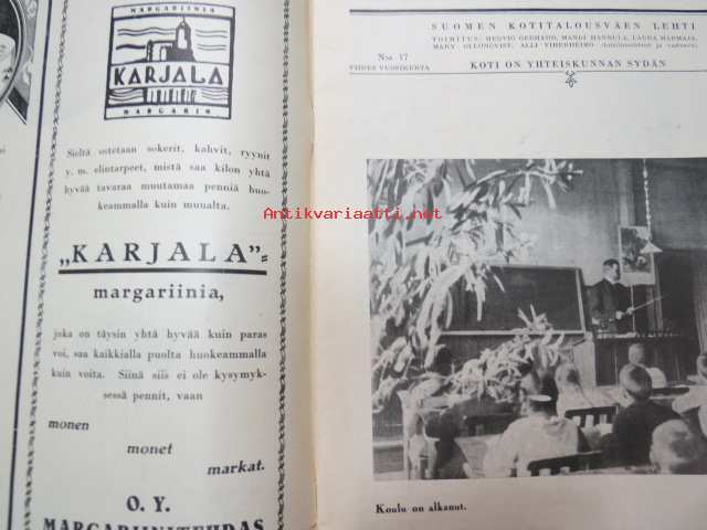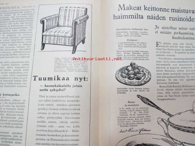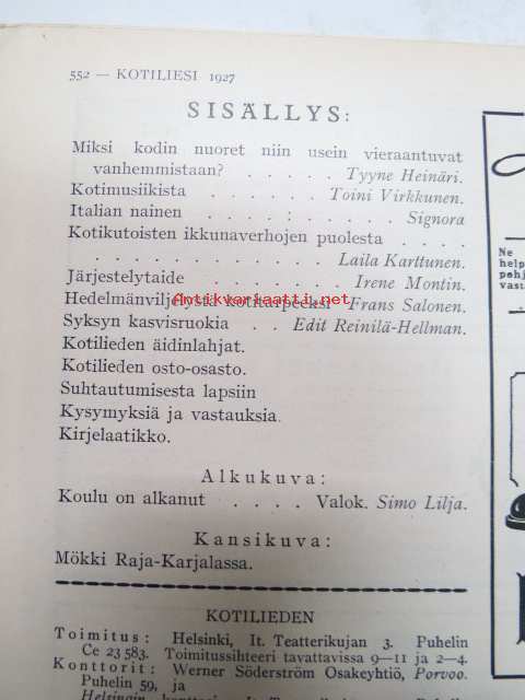 Kotiliesi 1927 nr 17, syyskuu I, 1.9.1927, sis. mm. seur. artikkelit / kuvat / mainokset; Kansikuvitus Aarno Karimo (Mökki Raja-Karjalassa), Fazer Kultakaramelli, Karjala-margariini, Kotimusiikista, Italian nainen, Kotikutoisten ikkunaverhojen puolesta, Järjestelytaidosta, Frans Salonen - Hedelmänviljelystä kotitarpeiksi II, Syksyn kasvisruokia, Tekan Ilona saippua - Laulu Ilonasta, Finlayson, ym.20 x 27 cm.