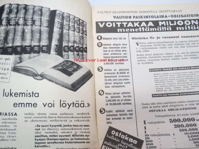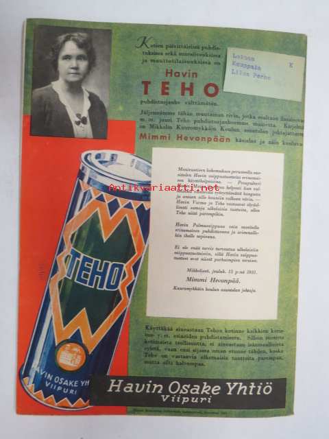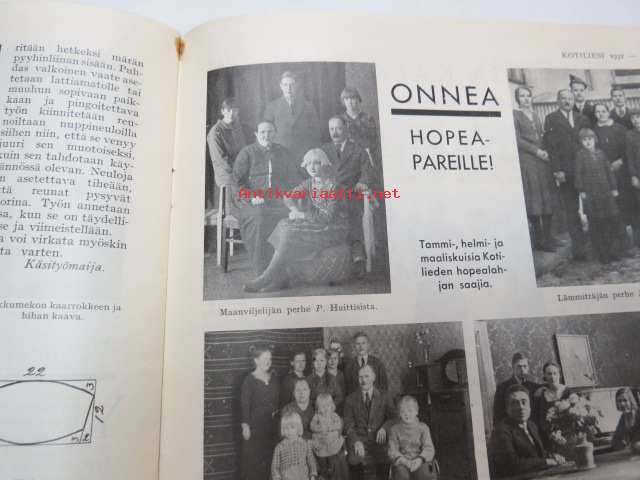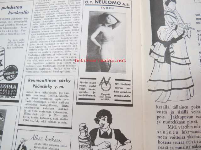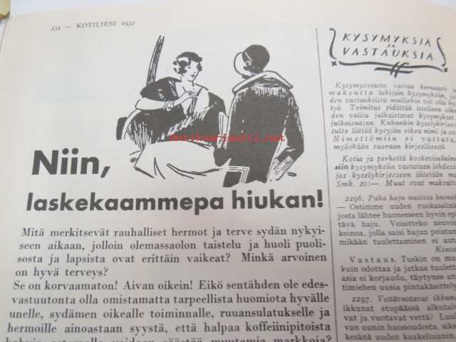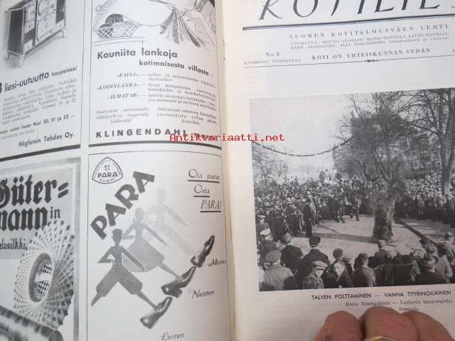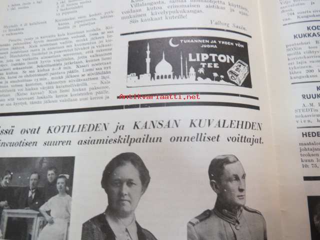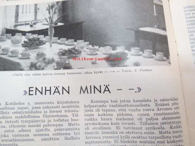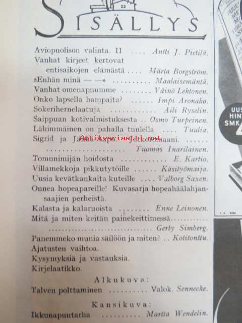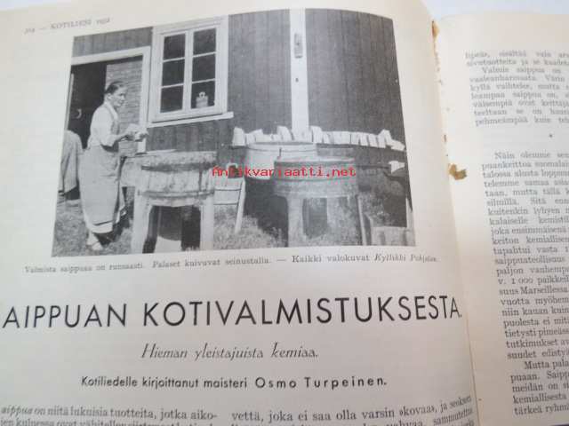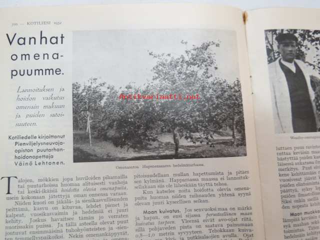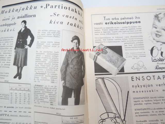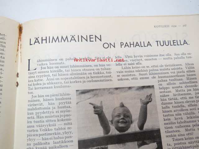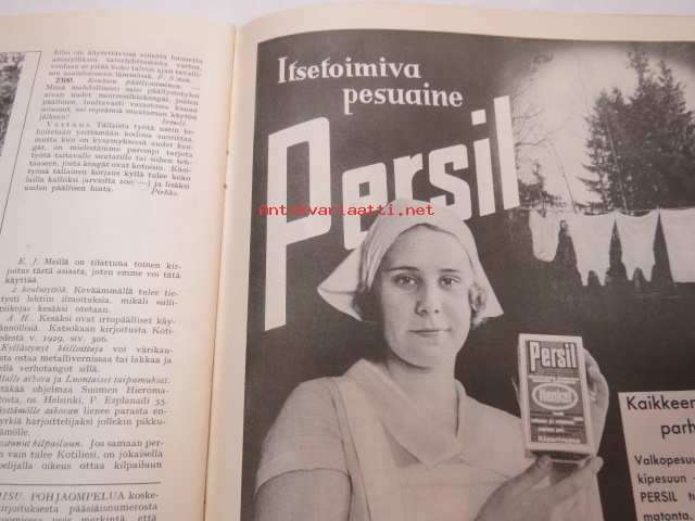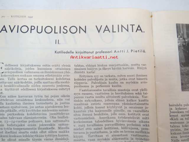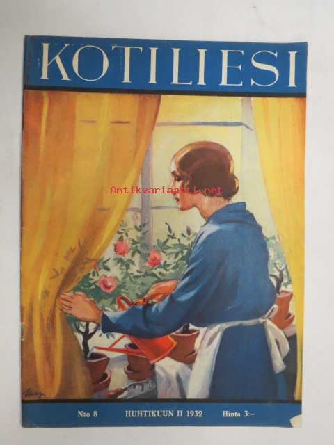 Kotiliesi 1932 nr 8, huhtikuu II, 15.4.1932, sis. mm. seur. artikkelit / kuvat / mainokset; Kansikuvitus Martta Wendelin, Orvo lastensaippua, Aviopuolison valinta II, Märta Borgström os. Arppe - Vanhat kirjeet kertovat entisaikojen elämästä, Vanhat omenapuumme, Onko Lapsella hampaita, Sokerihernelaatuja, Osmo Turpeinen - Saippuan kotivalmistuksesta, Tomunimijän kunnossapito, Kalasta ja kala ruoista, Panemmeko munia säilöön ja miten?, Persil, Suolahden Tehtaat - Oma kesämaja, Havin Oy Teho, ym. Takakannessa Havin Mainos, jossa Mimmi Hevonpää pikkukuvassa.21 x 29 cm.