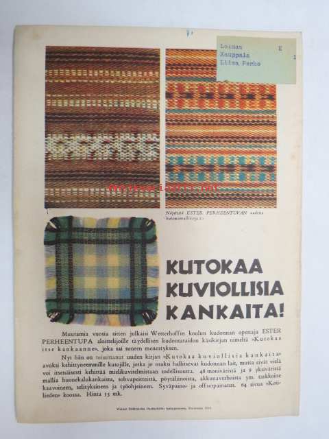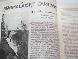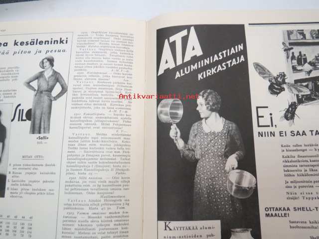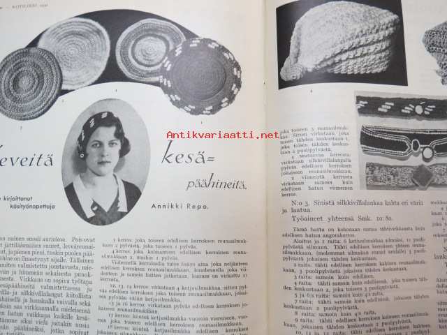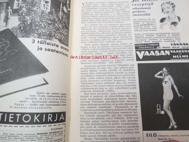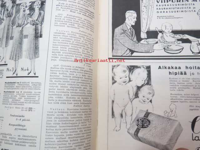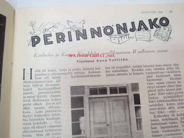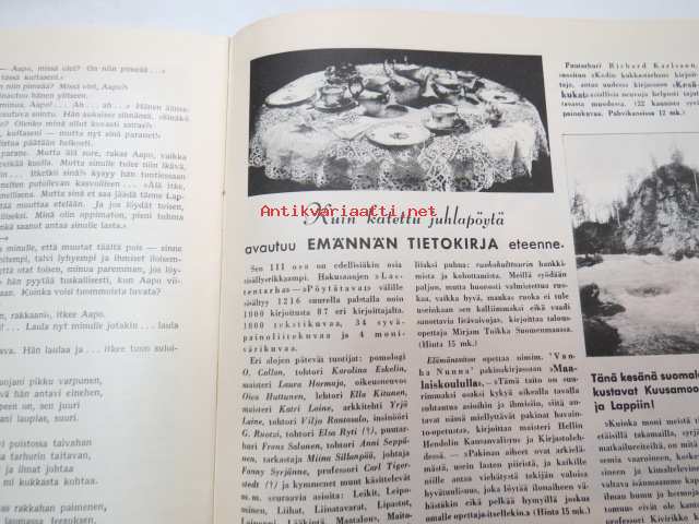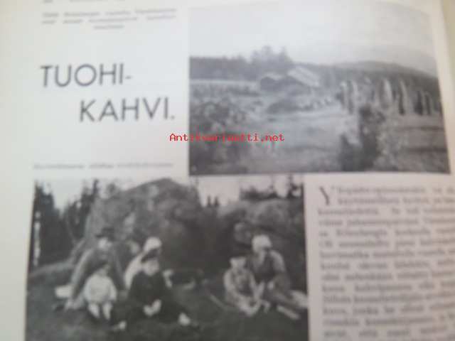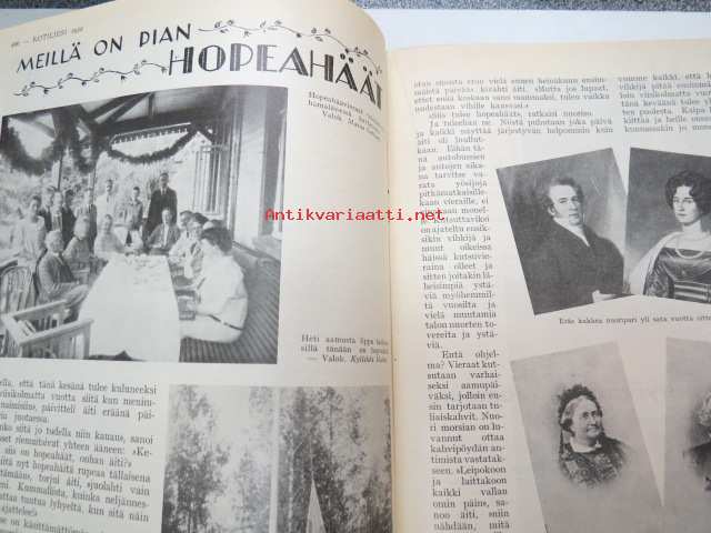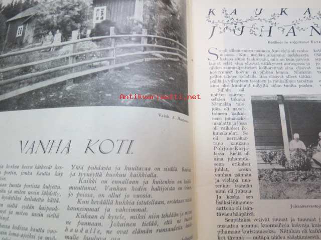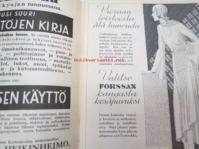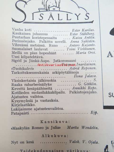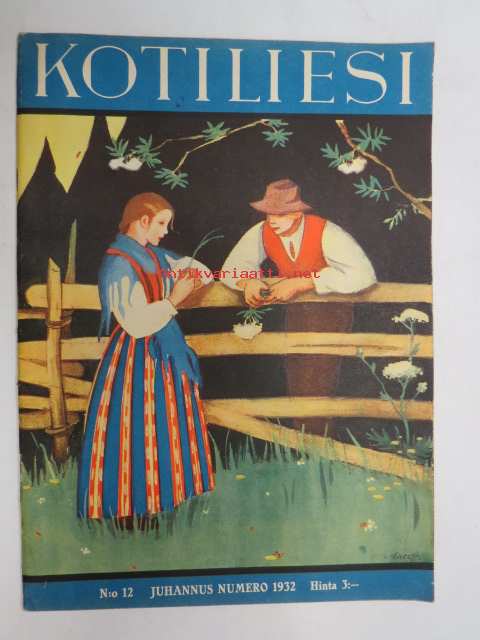 Kotiliesi 1932 nr 12, kesäkuu II, 15.6.1932, sis. mm. seur. artikkelit / kuvat / mainokset; Kansikuvitus Martta Wendelin, Forssan kangasta, Kodak Six 20, Puutarhan koristepensaita, Juhannus, Suomalaiset laulavat - tunnetko maakuntalaulut?, Meillä on pian hopeahäät, Tuohikahvi - kahvinkeiton onnistuminen tuohipannulla, Tarkoituksenmukaisia arkipöytäliinoja, Raaka rabarberisäilyke, Keveitä kesäpäähineitä, Laila Karttunen - pöytäliina (mallikuva), ym.21 x 29 cm.