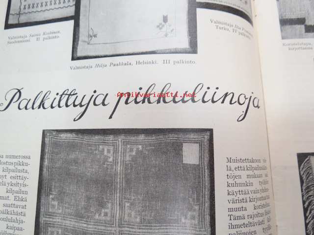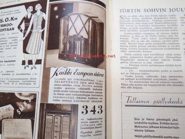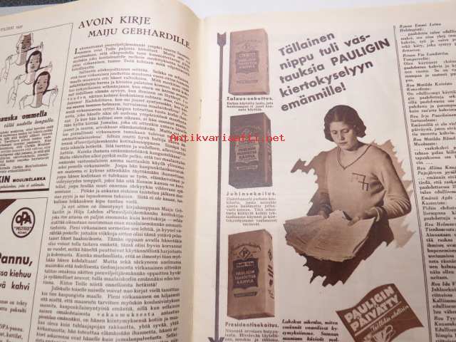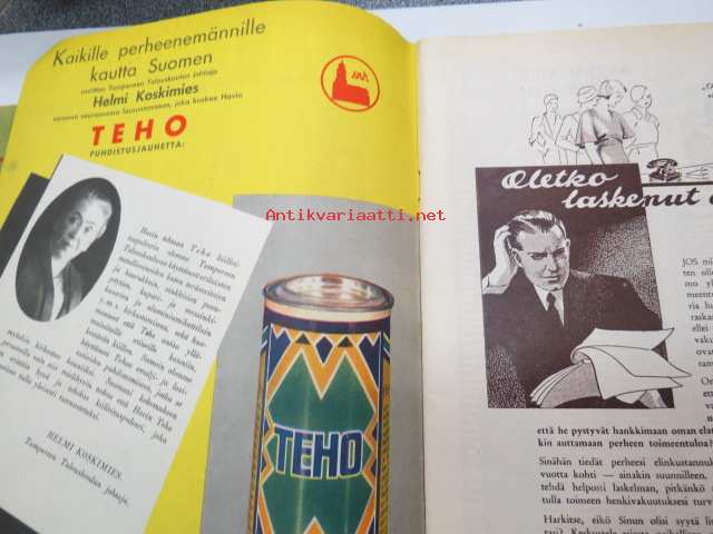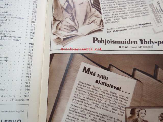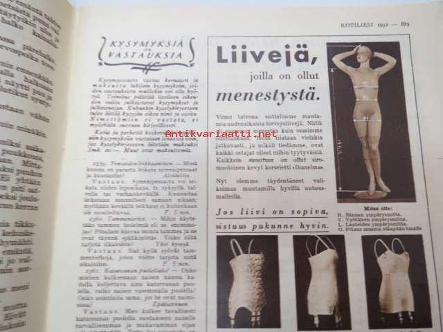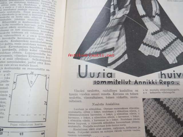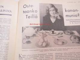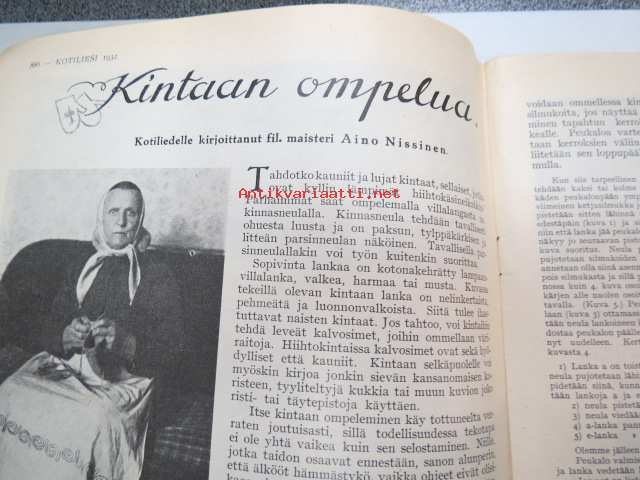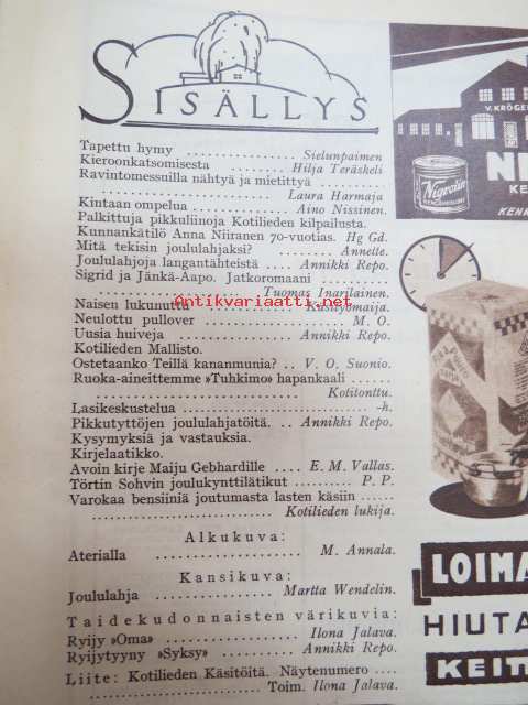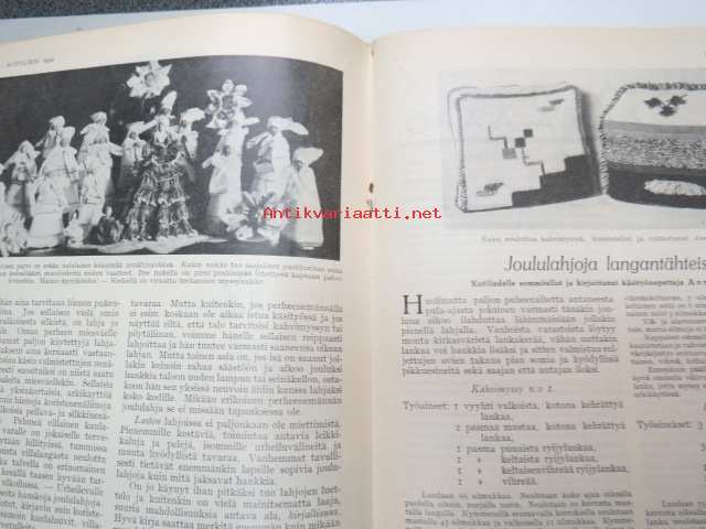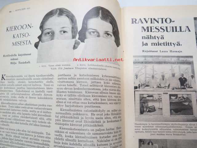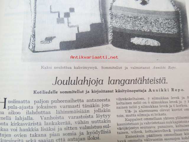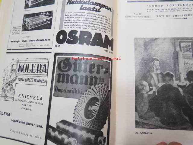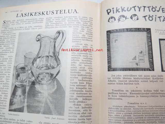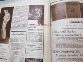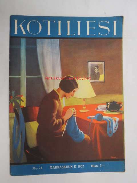 Kotiliesi 1932 nr 22, marraskuu II, 15.11.1932, sis. mm. seur. artikkelit / kuvat / mainokset; Kansikuvitus Martta Wendelin, Havin Teho, Pauligin päivätty, Kannaksen Lelu Oy - Terijoki, Kieroonkatsomisesta, Ravintomessuilla nähtyä ja mietittyä, Aino Nissinen - Kintaan ompelua, Mitä tekisin joululahjaksi?, Naisen lukunuttu, Ruoka-aineittemme "Tuhkimo" - hapankaali, Pikkutyttöjen käsitöitä, Lasikeskustelua, Neovius, ym.21 x 29 cm.