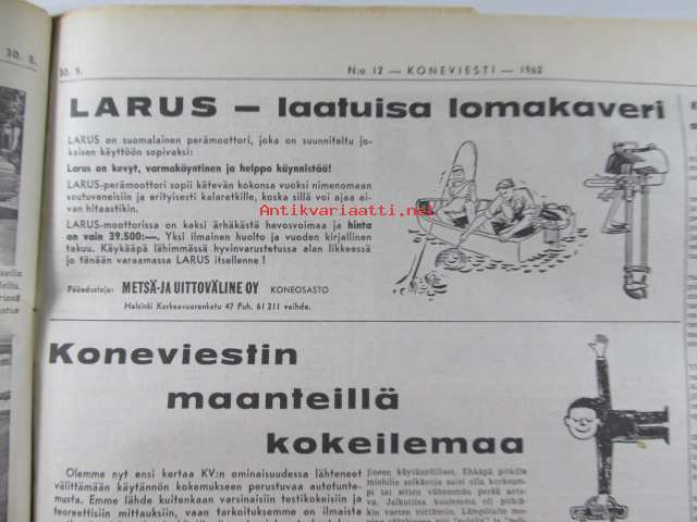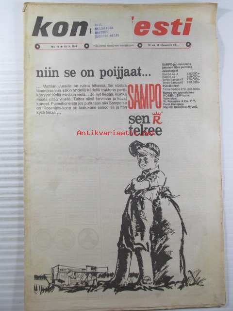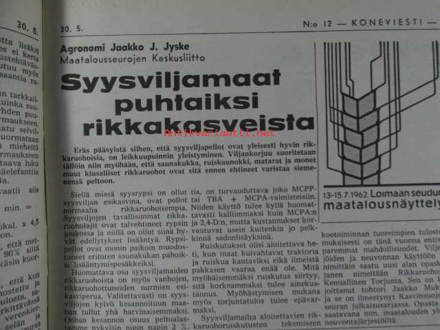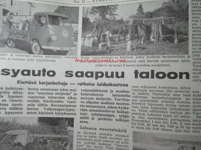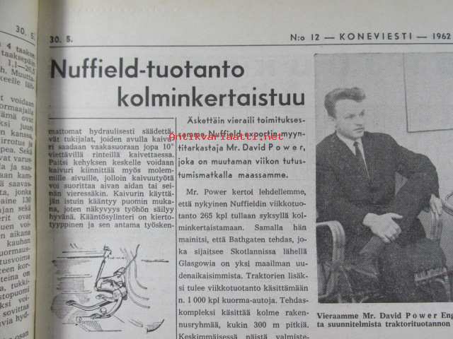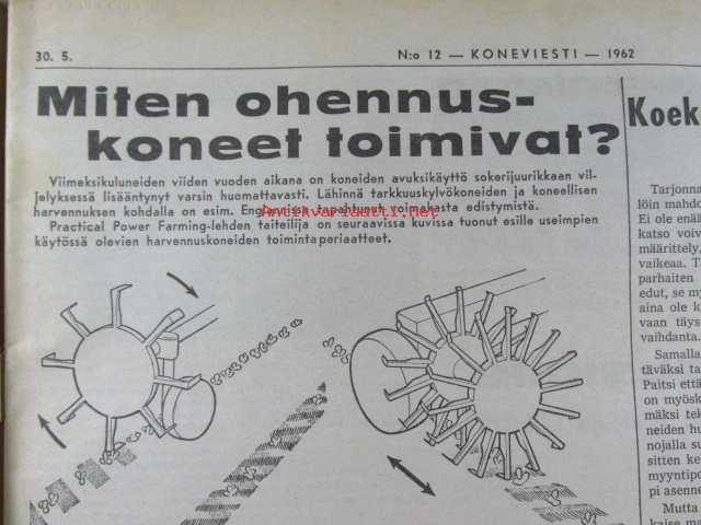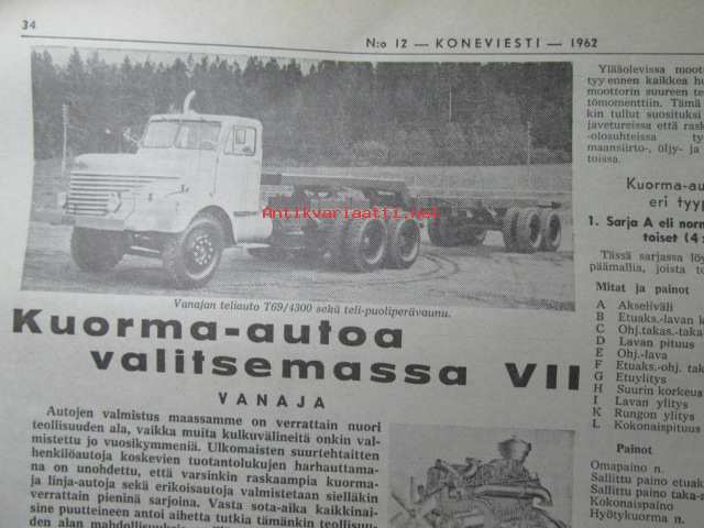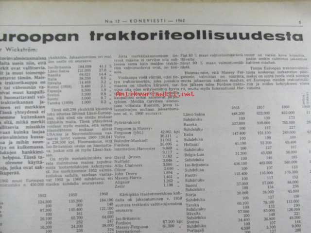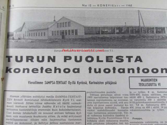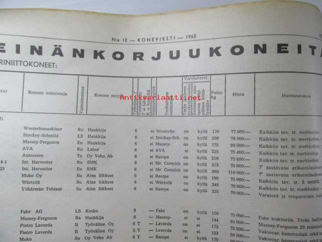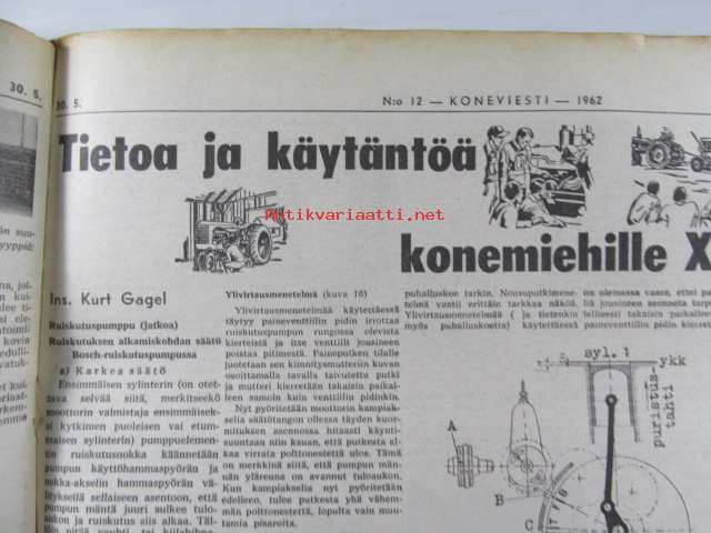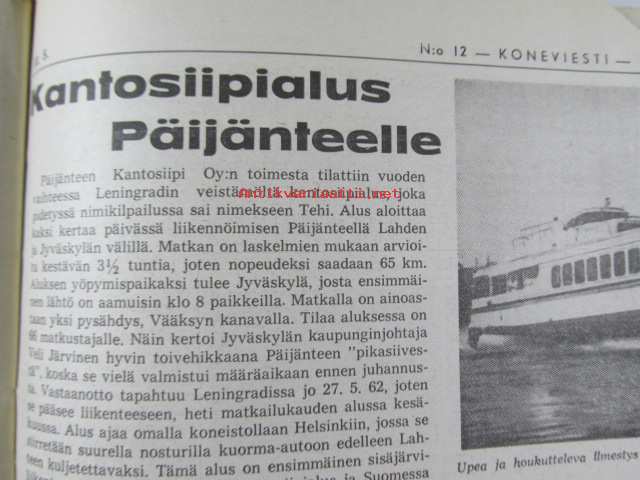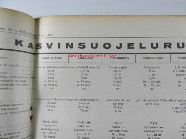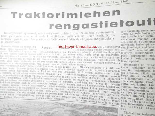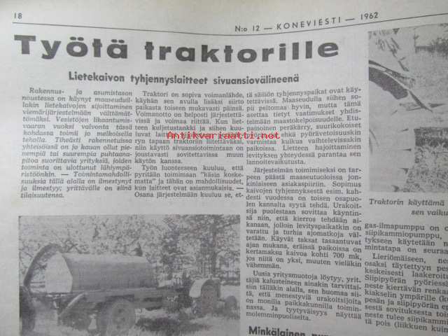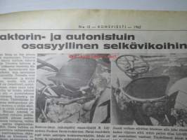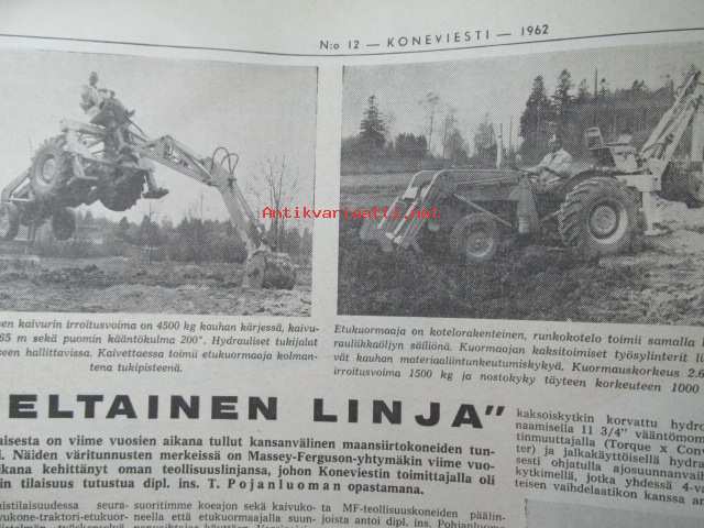 Koneviesti 1962 nr 12 -mm. Ojanperkauslaite maataloustraktoria varten - Syväpaja SPK 120, Hydrauliikka - traktorin kehityksen avain, Heinänkorjuukoneita - kuvat ja tekniset tiedot, Brittien Suurnäyttely Tukholmassa, Lypsyauto saapuu taloon - kiertävä karjanhoitaja ratkaisu laidunkautena, Kasvinsuojeluruiskut - tekniset tiedot, Turun puolesta konetehoa tuotantoon Sampsa-tehtaat Kyrössä Karinaisissa, BMW Coupe 3200 S, Kuorma-autoa valitsemassa Vanaja kuorma-autot, Maailman nopein sarjavalmisteinen vakioauto - Studebaker Avanti -63, Kantosiipialus Päijänteellä, katso sisältö kuvista tarkemmin.28 x 43 cm.