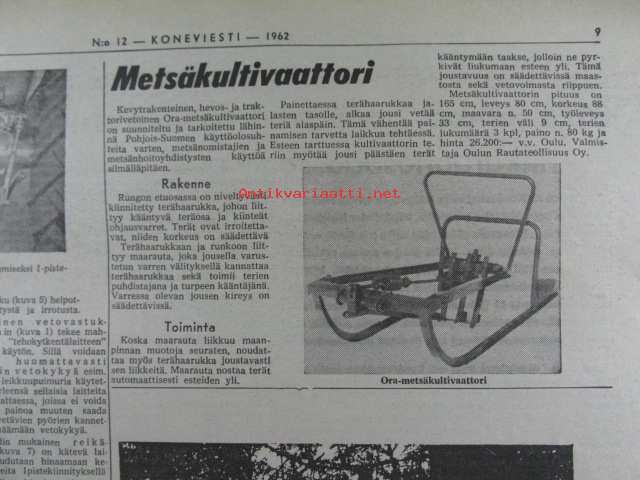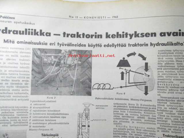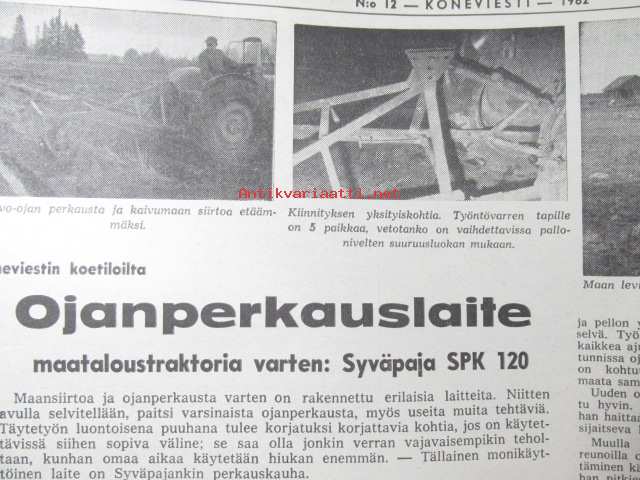 Koneviesti 1962 nr 12 -mm. Ojanperkauslaite maataloustraktoria varten - Syväpaja SPK 120, Hydrauliikka - traktorin kehityksen avain, Heinänkorjuukoneita - kuvat