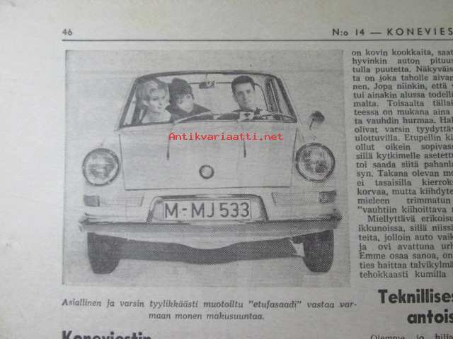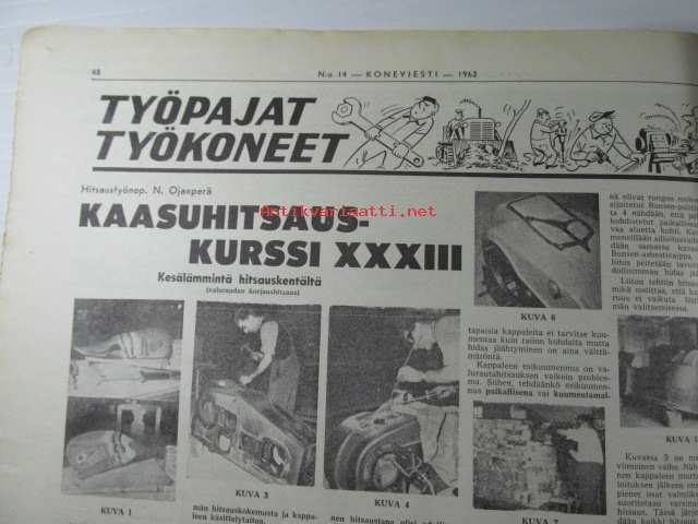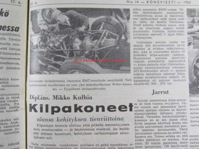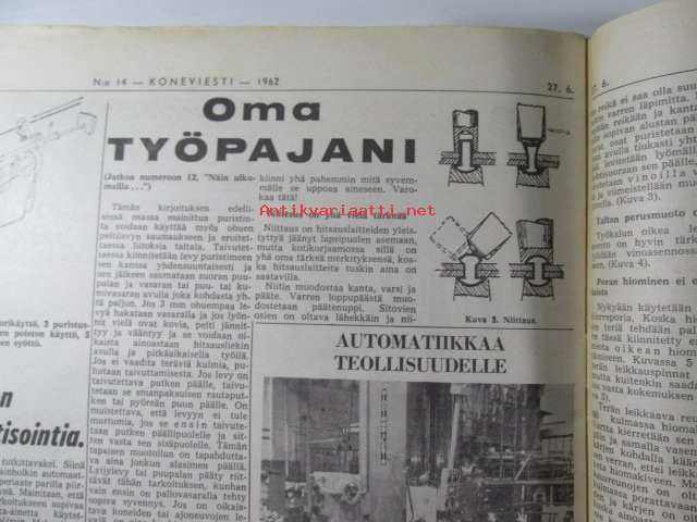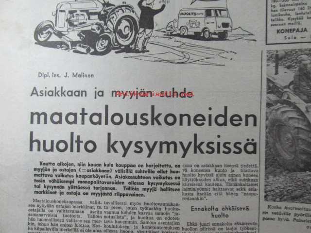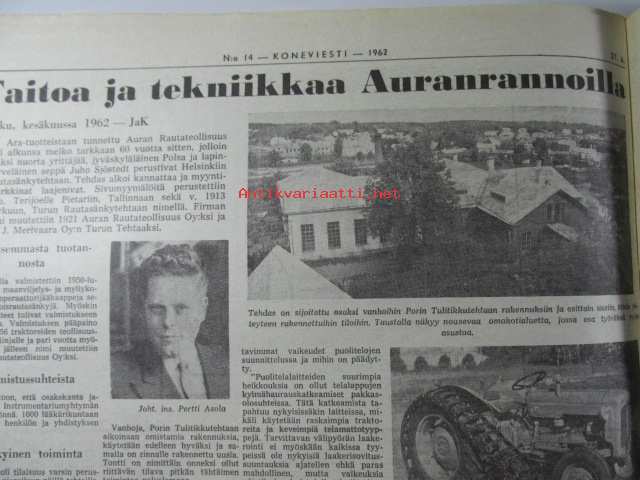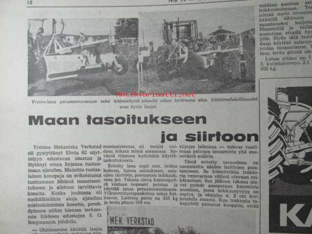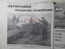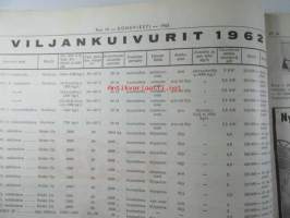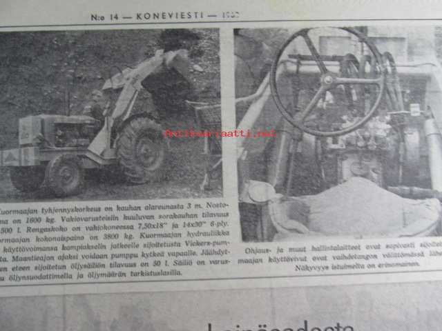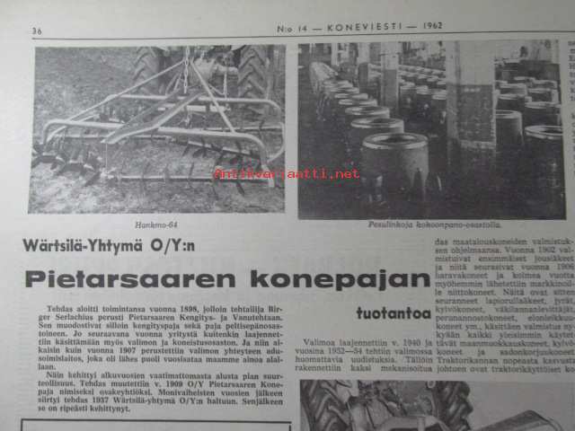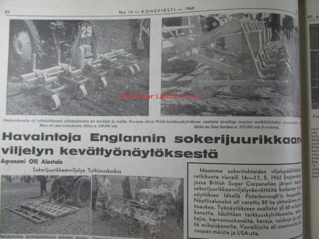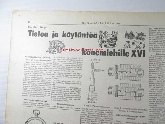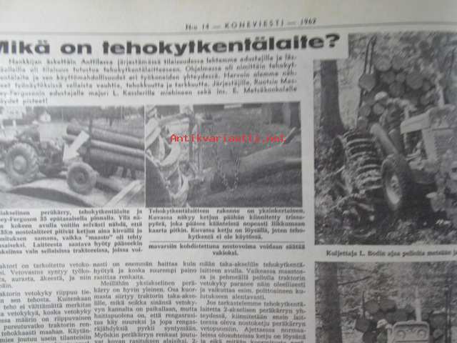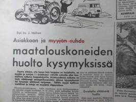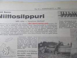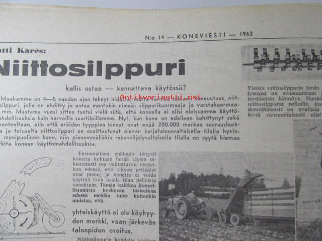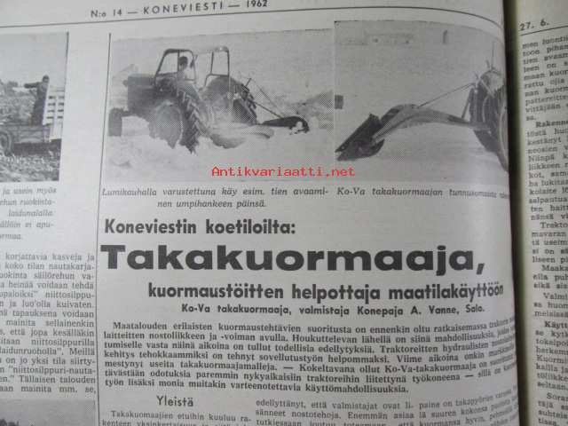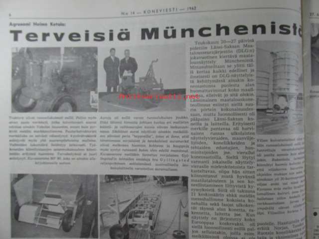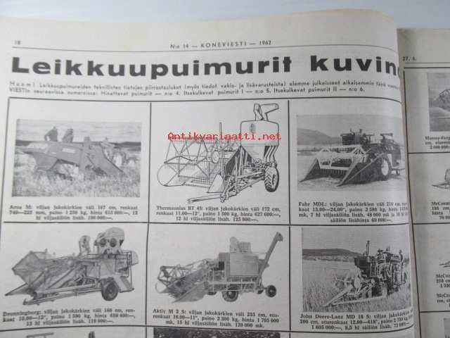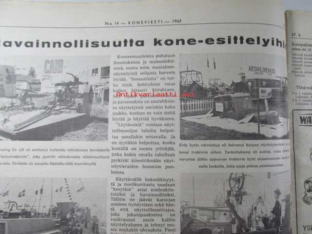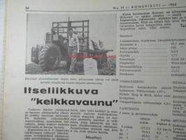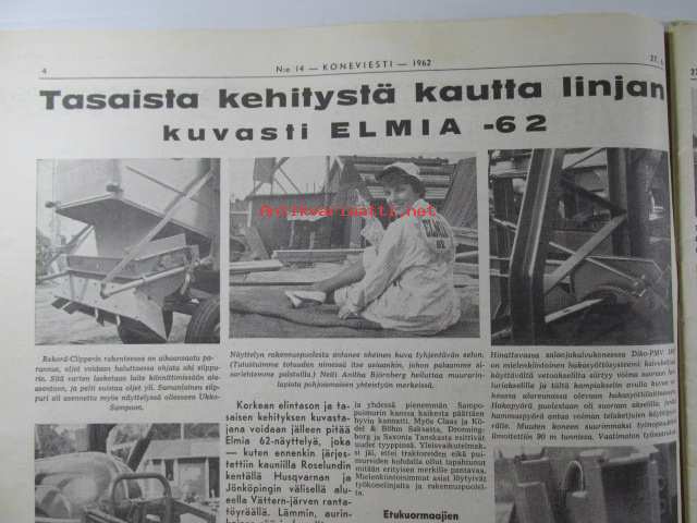 Maaseudun Ammattilehti Oy, 1962 Koneviesti 1962 nr 14 -mm. Elmia 1962. Itsesitojia Fella - JF kevytsitoja - McCormick D-7 - HErkules - JF -etusitoja TF5K, Leikkuupuimurit kuvina, Viljankuivurit 1962 - tekniset tiedot, Kotieläinten koneellisesta ruokinnasta Länsi-Saksassa, Niittosilppuri - kallis ostaa kannattava käytössä, Ko-Va takakuormaaja, Wärtsilä konepajaO/Y:n Pietarsaaren konepajan tuotantoa, Itsekulkeva leikkuupuimuri Favorit esittäytyy, Taitoa ja tekniikkaa Aurajoenrannoilla ARA, BMW LS Luxus, katso sisältö kuvista tarkemmin.28 x 43 cm.