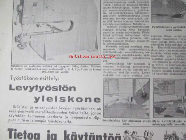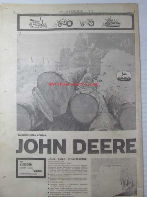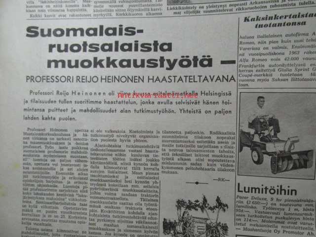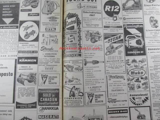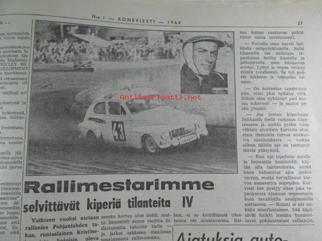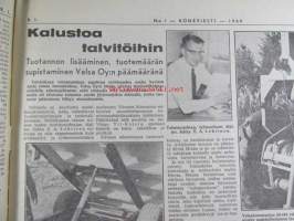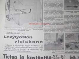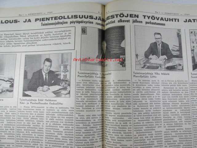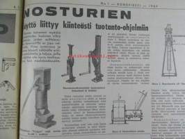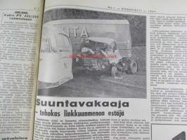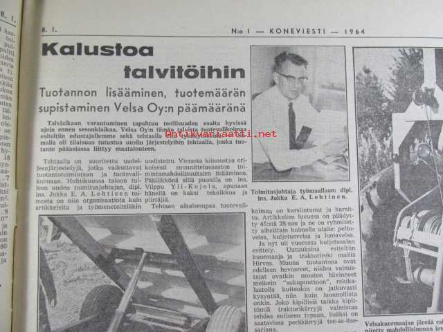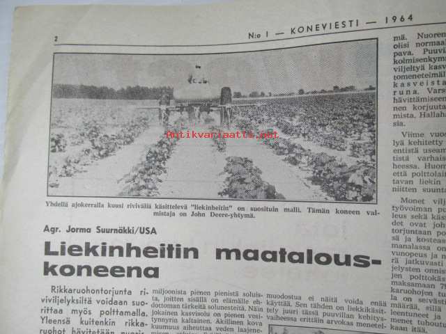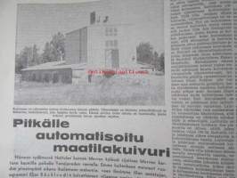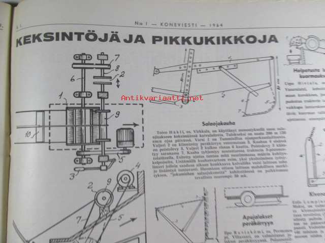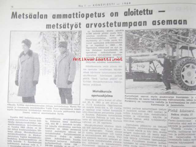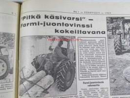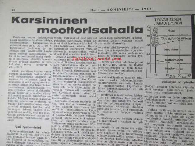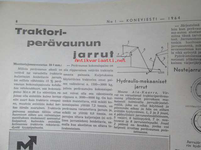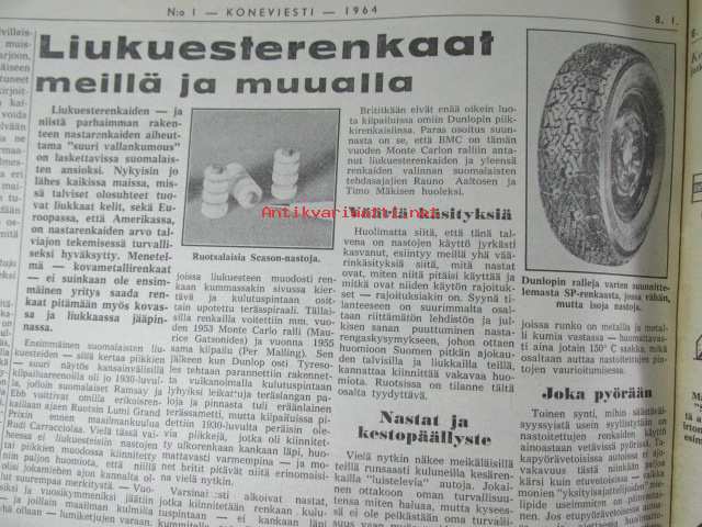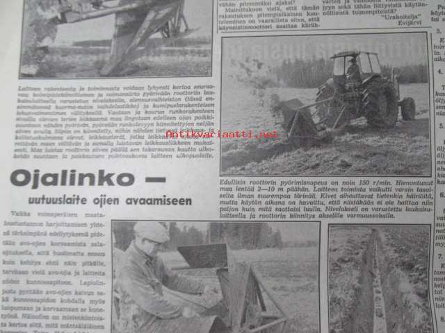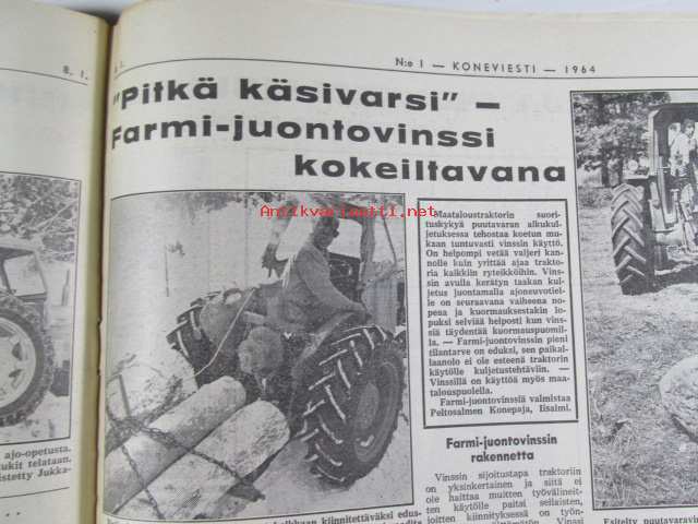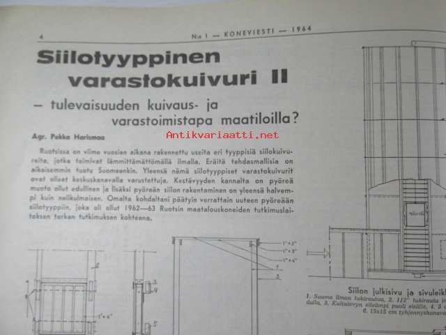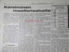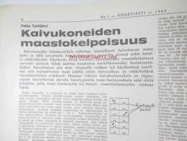 Koneviesti 1964 nr 1 -mm. Liekinheitin maatalouskoneena, Siilotyyppinen varastokuivuri, Ojalinko - uutuuslaite ojien avaamiseen, "pitkä käsivarsi" Farmi-juontovinssi kokeiltavana, Joka kymmenes omakotitalo rakennetaan pyörille, Argentiinan Grand Prix, katso sisältö kuvista tarkemmin.28 x 43 cm.