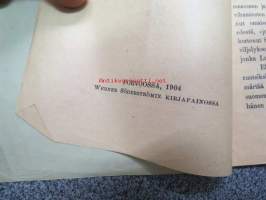 | Saatavilla | 1 kpl | | Julkaisuvuosi | 1904 | | Sivuja | 22 | | Kunto | K2 | | Sidonta/painoasu | Nidottu (pehmeäk.) | | Kielet | Suomi |