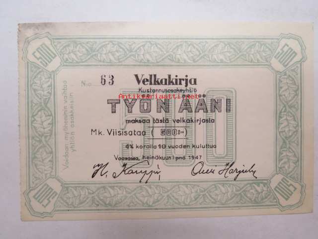 Kustannusosakeyhtiö Työn Ääni - Velkakirja nr 63, 500 mk - maksaa tästä velkakirjasta 10 vuoden kuluttua 4% korolla, Vaasa 1947