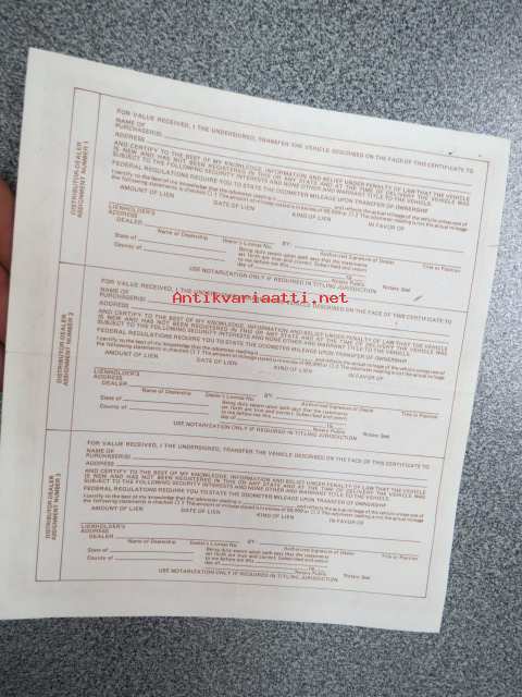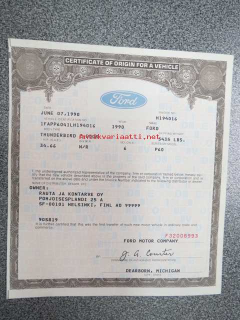 Certificate of origin of a vehicle - Ford Thunderbird 2-door, IFAPP6041LH194016 1990, owner; Rauta ja Konetarve Oy -auton alkuperätodistus Fording tehtaalta used autosta