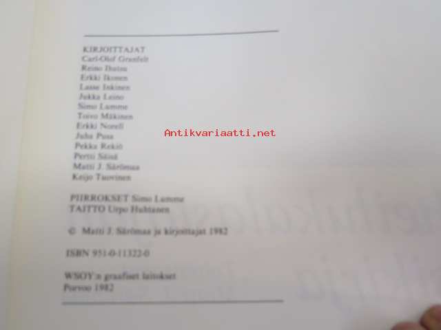 | Saatavilla | 1 kpl | | Julkaisuvuosi | 1982 | | Sivuja | 251 | | Painos | 1. | | Kunto | K3 | | Sidonta/painoasu | Sidottu (kansipaperit) | | ISBN | 951-0-11322-0 | | Kielet | Suomi |
