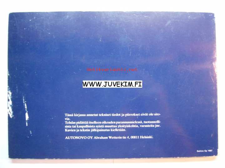 | Saatavilla | 1 kpl | | Julkaisuvuosi | 1987 | | Sivuja | 125 | | Kunto | K3 | | Sidonta/painoasu | Nidottu (pehmeäk.) | | Kielet | Suomi |