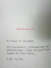 | Saatavilla | 1 kpl | | Julkaisuvuosi | 1981 | | Sivuja | 113 | | Kunto | K2 | | Sidonta/painoasu | Muu | | Kielet | Suomi |