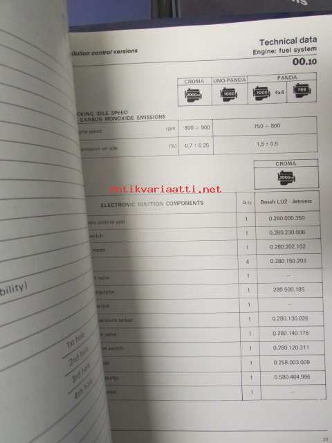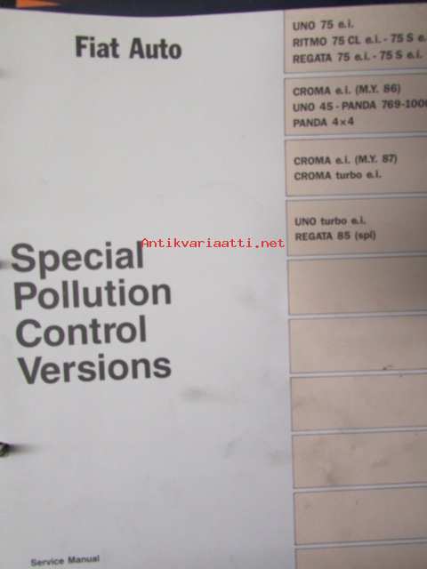 Fiat Service Manual Special Pollution Control Versions Uno 75 e.i., Ritmo 75 CL e.i. - 75 S e.i. - Regata 75 e.i. - 75 S e.i. - Croma e.i. (M.Y.86) - Uno 45 - Panda 769-1000, Panda 4x4, Croma e.i. (M.Y.87) - Croma Turboe.i., Uno Turbo e.i., Regata 85 (spi) - huoltokäsikirja