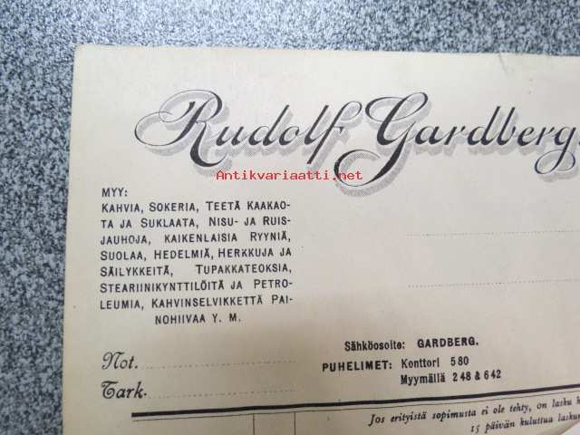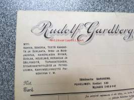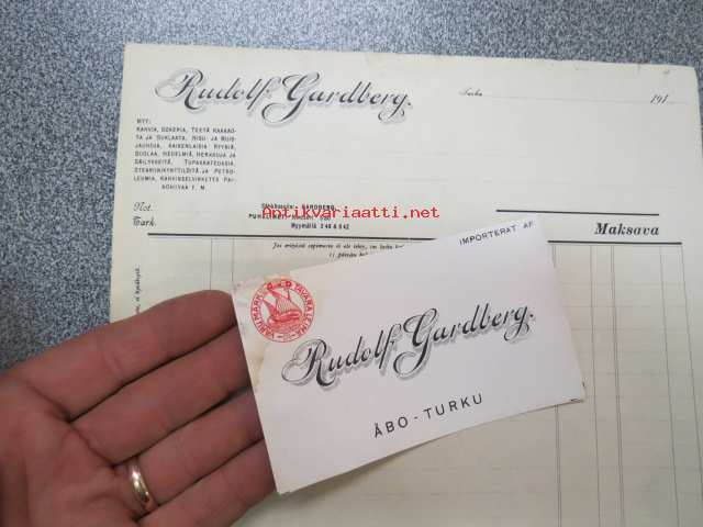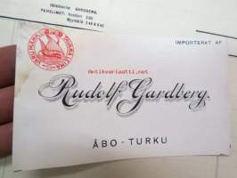 Importerad af Rudolf Gardberg Åbo - Turku -etikettipainate + firmalomake, lieneekö tämä ollut tupakka-askiin liimattuna etikettinä, sillä lomakkeen reunassa luetellaan mm. tupakkateosten, säilykkeiden, kahvin, sokerin ym. olevan myynnissä - suomennettuna; "Rudolf Gardbergin maahantuomaa"