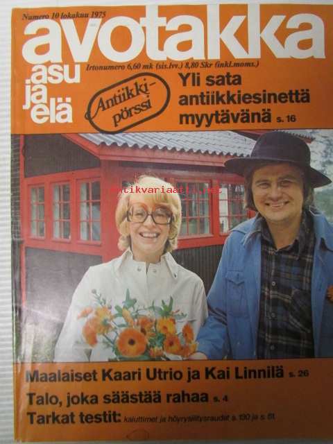 Avotakka 1975 nr 10 sis. mm. seur. artikkelit / kuvat / mainokset; Kesän kuumimmat kuvat, Me maalaiset - Kaari Utrio ja Kai Linnilä, Satu ja Ilkka Torstila harrastavat vanhojen esineiden keräilyjä, katso sisältö kuvista tarkemmin.21 x 30 cm.