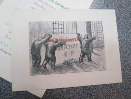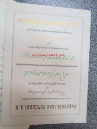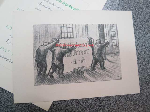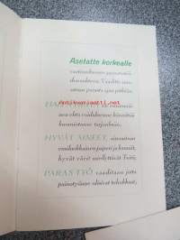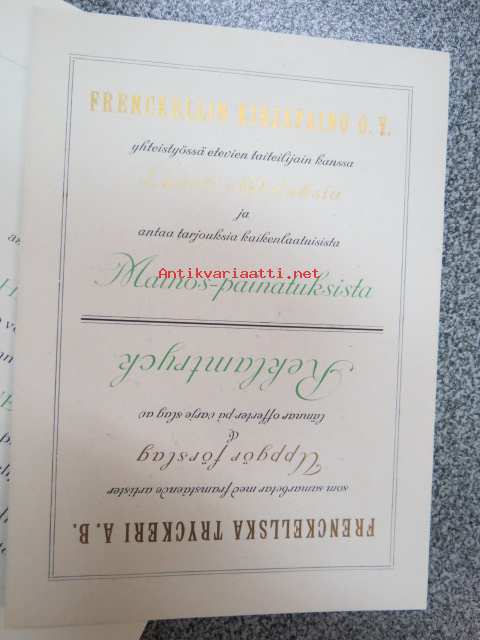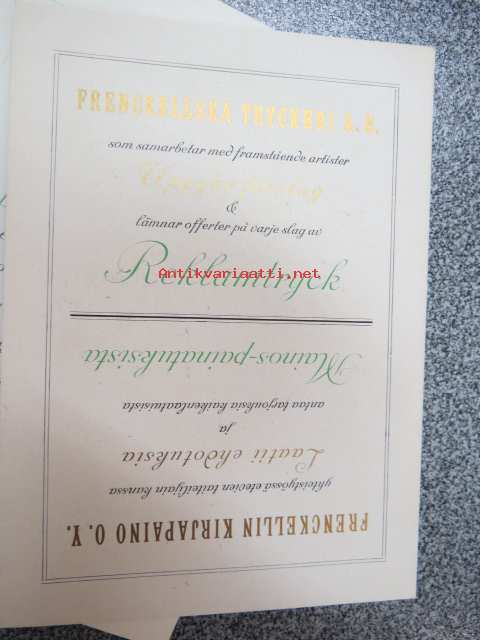 Frenckellin Kirjapaino Osakeyhtiö Helsingissä - mainosvihkonen "Ensimmäisten Helsingissä 1928 pidettyjen Reklaamimessujen johdosta painettu", sisältää erillisen kortin