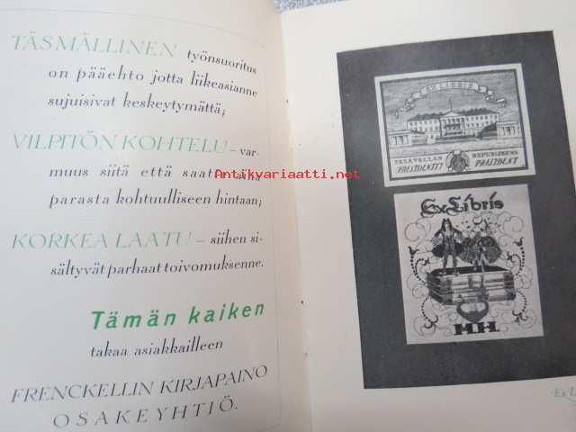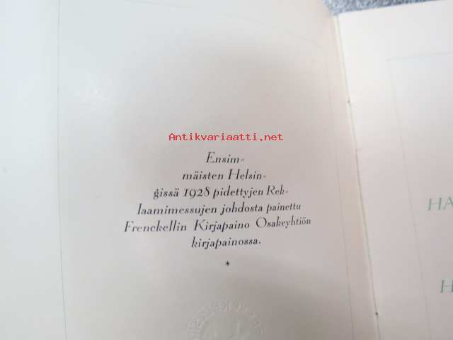 Frenckellin Kirjapaino Osakeyhtiö Helsingissä - mainosvihkonen "Ensimmäisten Helsingissä 1928 pidettyjen Reklaamimessujen johdosta painettu", sisältää