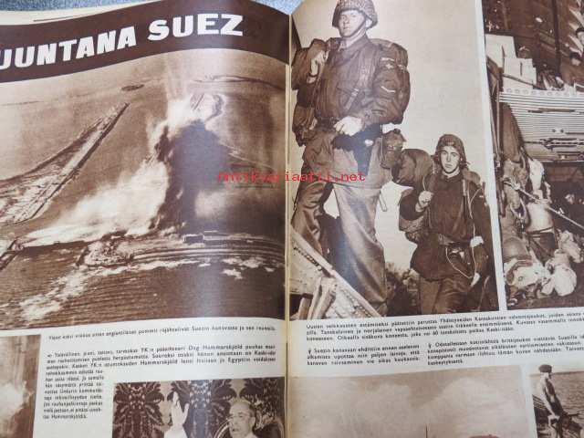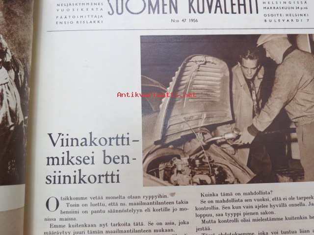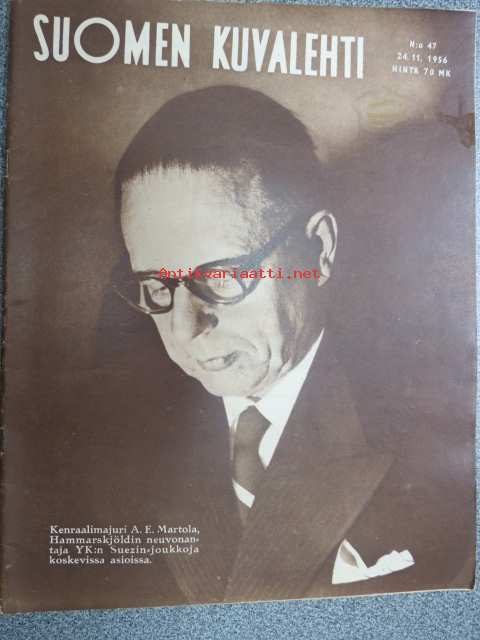 Suomen Kuvalehti 1956 nr 47, 24.11.1956, sis. mm. seur. artikkelit / kuvat / mainokset; Kansikuva Kenraalimajuri A.E. Martola, Upo, Tyro, Vasan leipää, ASA, Viinakortti - miksei bensiinikortti, Tittelinkipeys, Entä jos tuontimme tyrehtyisi?, Kisojen aattona - Melbourne, 275 vuotta suomalaista lasia, Moskovan Eeva 1956, Tarunomainen Fangio, Suuntana Suez, Boston, Omega, ym. Onnittelukuvissa mm. Karlo Saarialho 70v, Waldemar Viisterä 60v, Johannes Nyrkiö 60v, Erkki Sammalkivi 60v, Leo Aario 50v, Heidi Halleen 50v.