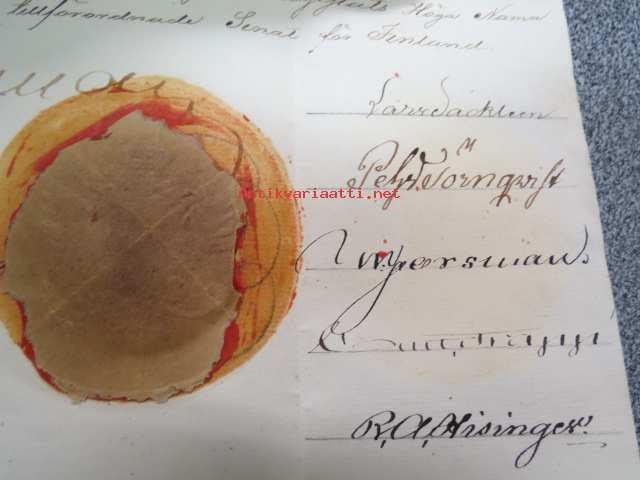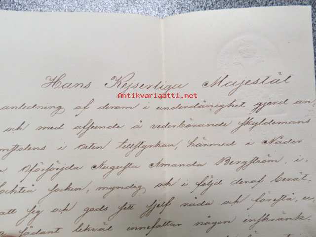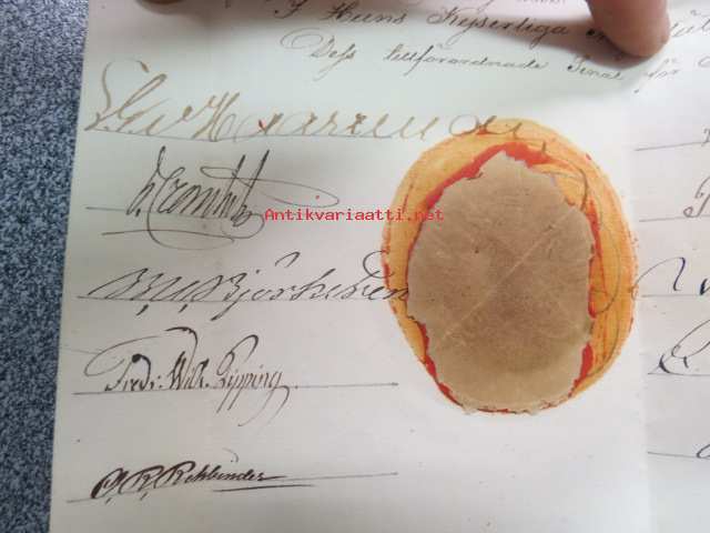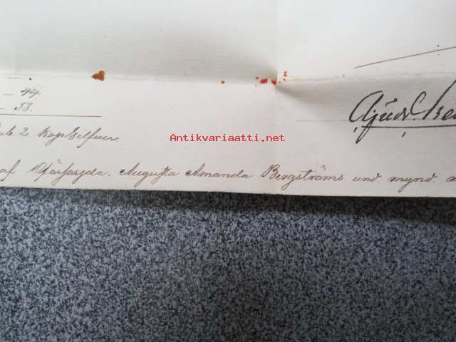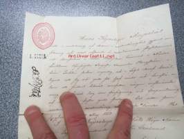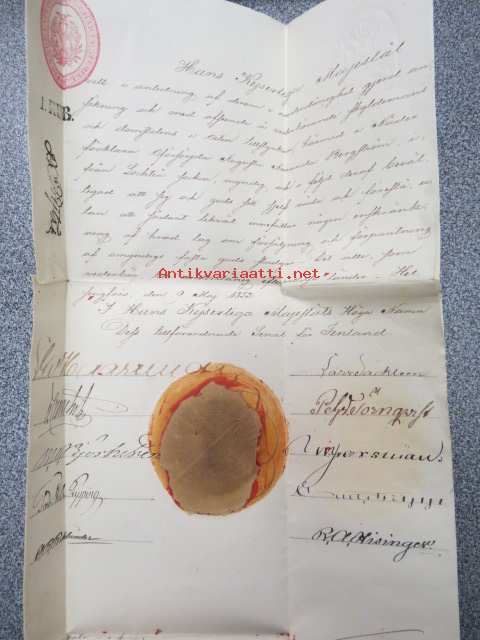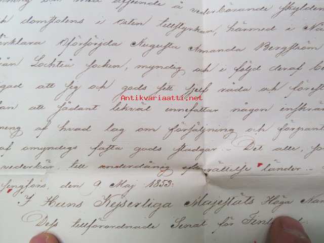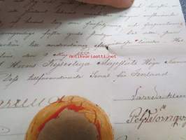 Suomen Senaatti - asiakirja 9.5.1853, ruotsinkielinen, koskien Augusta Amanda Bergström´in (Lohtaja) omistaman kiinteistön hallinta- ja hyödyksikäyttöä, Senaatin leima ja alkuperäiset allekirjoitukset; Lars Gabriel von Haartman, Björksten, Fredrik Wilhelm Pipping, O.R. Rehbinder, Lars Sackleen, Pehr Törnqvist, Nordenswan?, R. Hisinger sekä pari muuta tunnistamatonta, 1 ruplan painettu sekä 1 ruplan koholeimattu leimamerkki