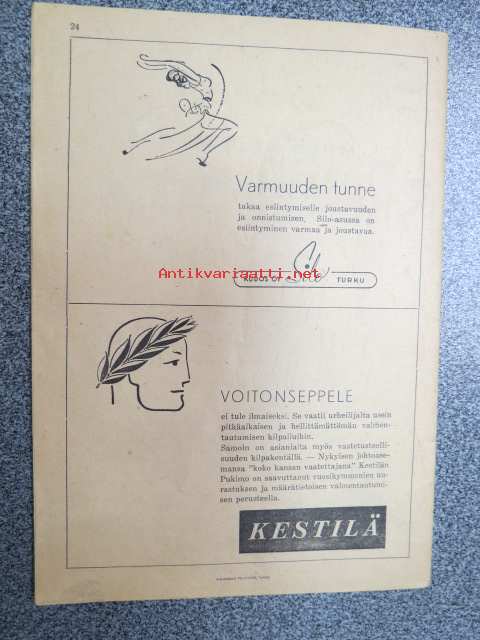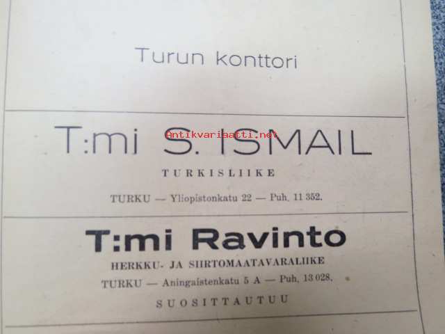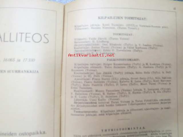 | Saatavilla | 1 kpl | | Julkaisuvuosi | 1946 | | Sivuja | 24 | | Kunto | K2 | | Sidonta/painoasu | Nidottu (pehmeäk.) | | Kielet | Suomi |