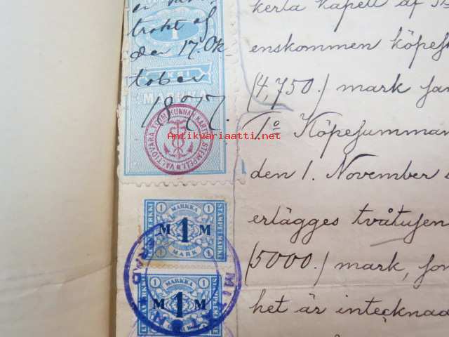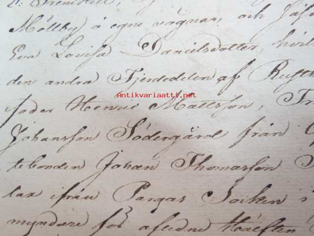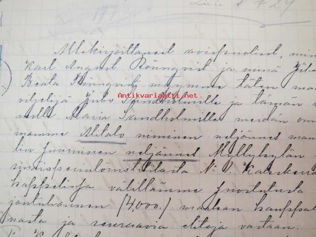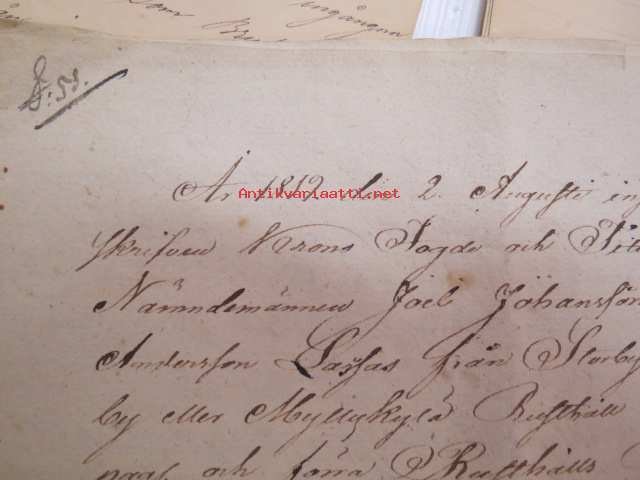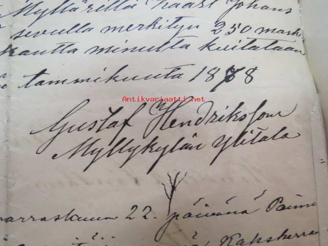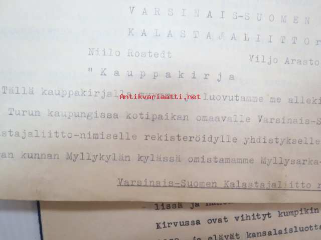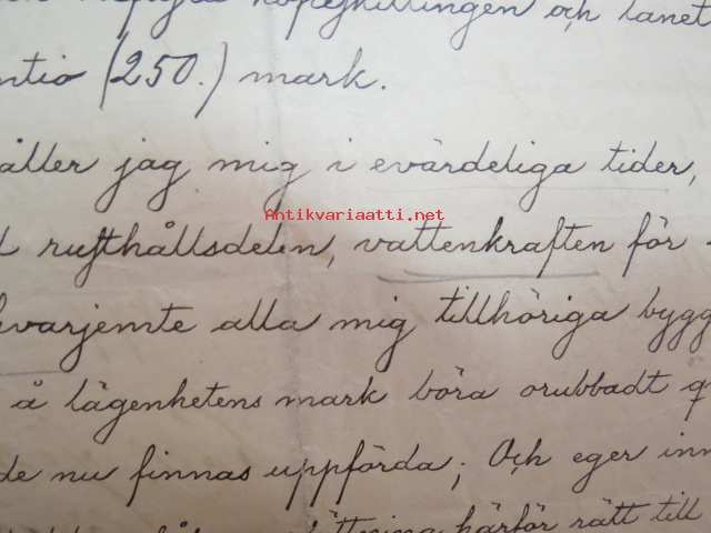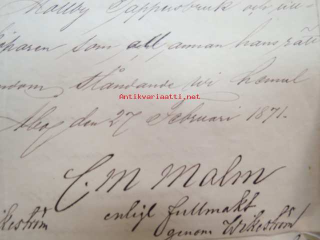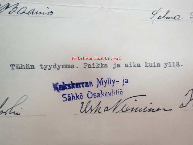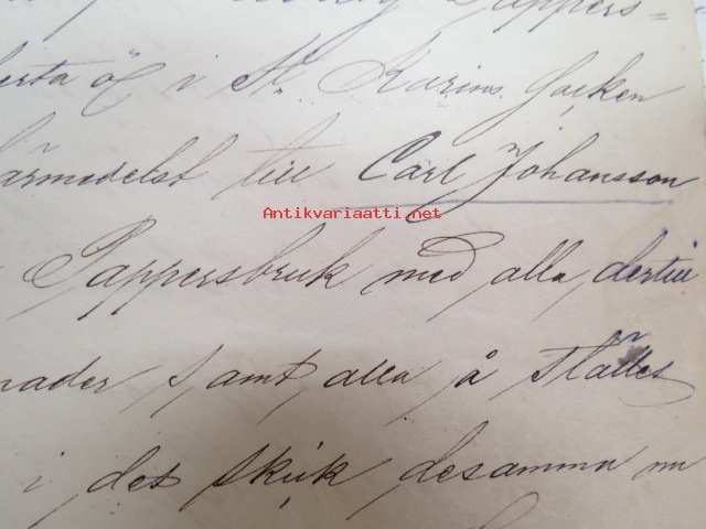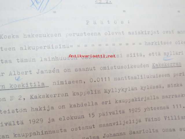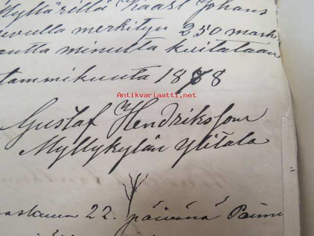 Kakskerta Möllby / Myllykylä Paperitehdas / Mylly - asiakirjoja ja kauppakirjoja paperitehtaan sekä myllytoiminnan ajoilta alkaen 1819 aina 1970-luvulle asti - viranomaisasioissa - kauppa- ja kiinteistöpaperit ainakin vuoteen 1962 asti katekamattomana sarjana? J.C.? Sevonin vuonna 1819 allekirjoittamassa 8-sivuisessa asiakirjassa historiatietoja alkaen vuodesta 1762, ruotsin- ja suomenkielisiä - mainintoja tekstissä; Möllby - Myllykylä Rusthåll, enkefru Margaretha Elisabeth Frenckell - handelsmännen Hans Henric Wittfoth & Jacob Brem - numera aflidne Academia Boktryckaren J. C. Frenckells sterbhus - till denna syn hafva vi allenast... enkefru Frenckell... - Had de nuvarande Mjölqvarnen dugas... - vettä ei saa padota ennen 18. toukokuuta...mainitaan Kuninkaan antamat privilegiot ja keisarin vahvistukset ko. asialle? - käsittelee myös tehtaan / rakennusten mittoja yms. - mitä ilmeisimmin tällä asikirjalla luotiin / vahvistettiin / todistettiin omistusoikeus ko. lumppupaperitehtaan kiinteistöön ja sen laitteisiin, josta se sittemmin muuntui tavalliseksi myllytoiminnaksi - joka tapauksessa arvokasta tietoa paperiteollisuuden alkuvaiheista sekä Turun seudun paikallishistoriasta ylipäätään - osa asiakirjojen kopioista toki arkistoissa, mutta ei ilmeisesti kaikki - ainakaan Sevonin selonteosta 1819 ei liene kopioita missään muualla? (enempien kyselyitten ja ihmettelyjen ja vaatimusten välttämiseksi on todettava, että nämä ovat tilimyynnissä yksityishenkilöltä myyntitoimeksiantona)