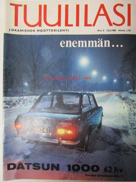 Tuulilasi 1968 nr 3, sis. mm. seur. artikkelit / kuvat / mainokset; Kannessa Datsun 1000, Talvikirje Englannista Reliant Regal 3/25 De Luxe, Daimler V8-250, TVR 2+2