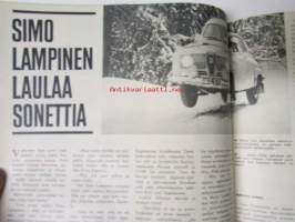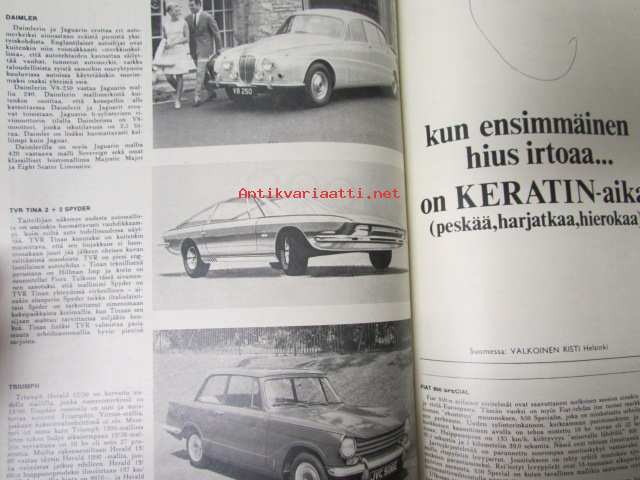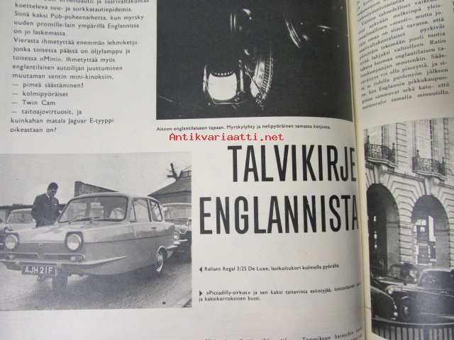 Yhtyneet Kuvalehdet Oy, 1968Tuulilasi 1968 nr 3, sis. mm. seur. artikkelit / kuvat / mainokset; Kannessa Datsun 1000, Talvikirje Englannista Reliant Regal 3/25 De Luxe, Daimler V8-250, TVR 2+2 Spyder, Triumph Herald 12/50, Simo Lampinen, Autoloma ulkomailla, Etuajo-oikeus, katso kuvista tarkempi sisältö.21 x 29 cm.