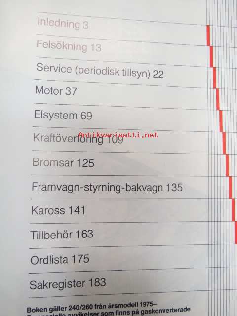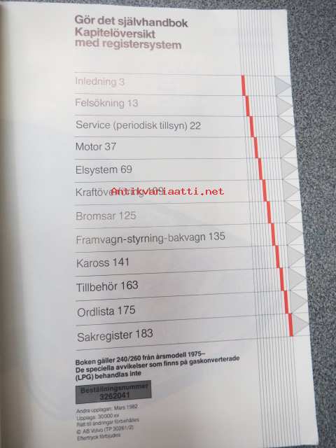 Volvo 240 / 260 - Gör det själv handbook - boken gäller 240/260 från årsmodell 1975-, speciella avvikelser somm finns på gaskonverterade (LPG) behandlas inte (andra upplagan) mars 1982